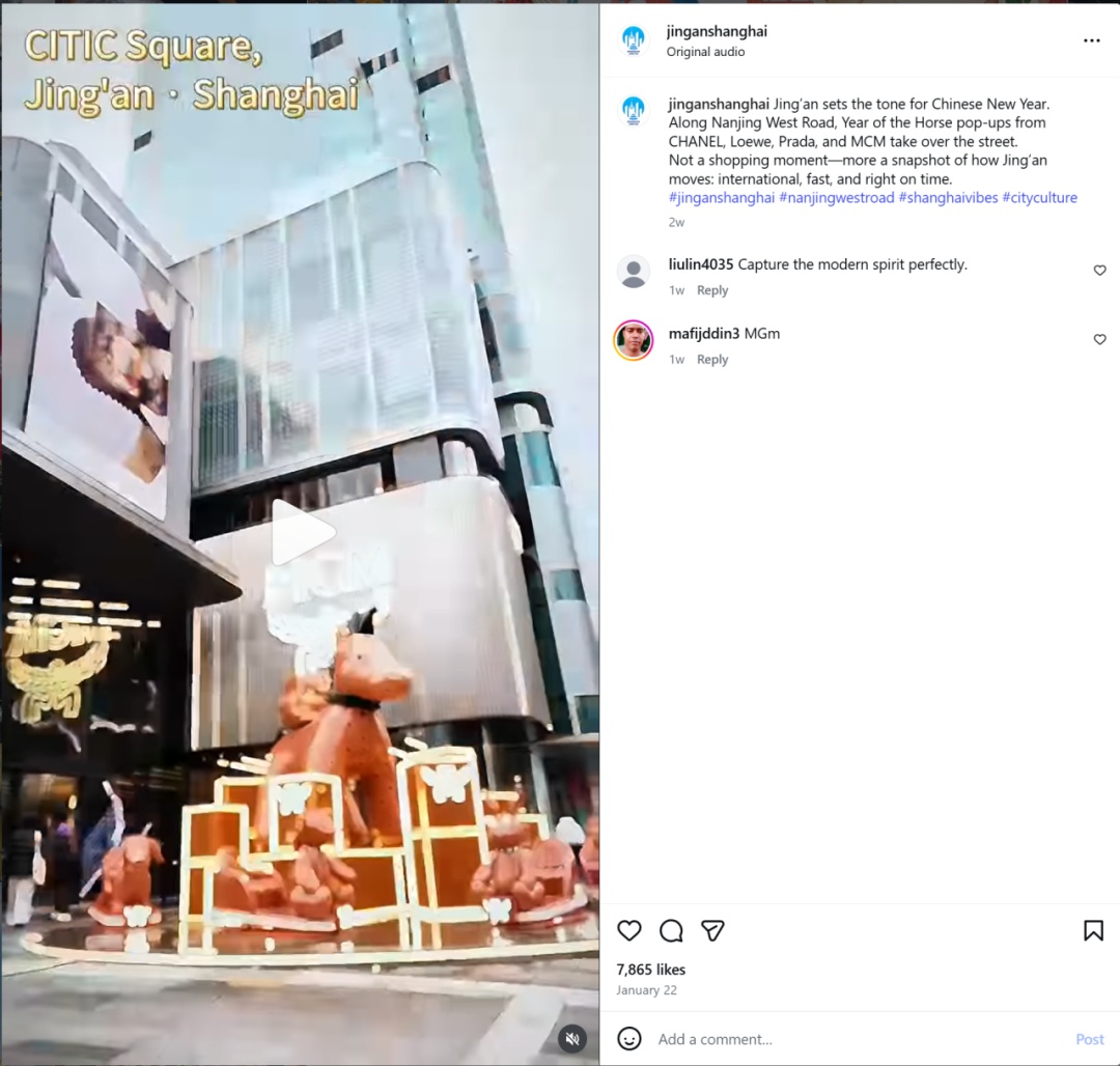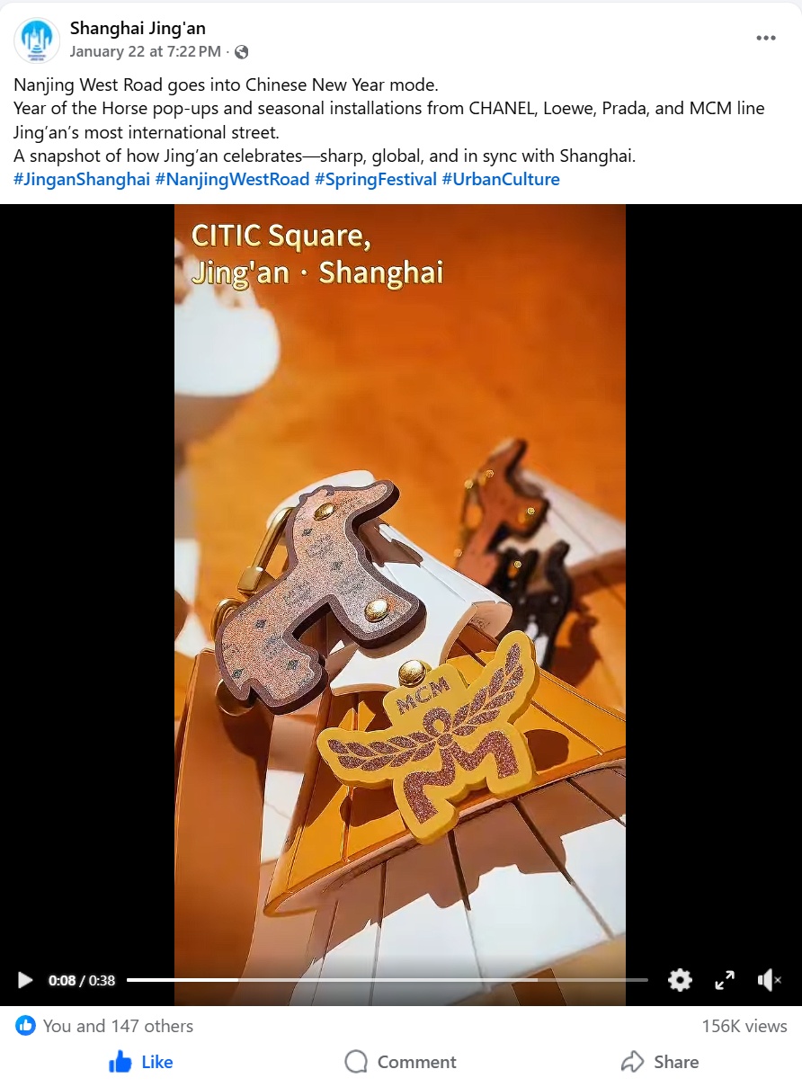 从LOEWE联手上美影挖掘经典IP,到Prada在百年宅邸重构生肖符号;从高能级国际首店的密集落户,到多元品牌新春活动的创造性落地,大量国际品牌在静安完成深度的“中国叙事”,也正通过静安海外社交媒体矩阵有效地传递至全球受众,不仅将国际品牌交融东西方美学、实践本地化表达的盛景传递至世界,也让马年春节成为一个可观、可感、可购的文化消费场景。