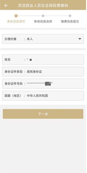 ②办理对象可为“本人”或“他人”,确认无误后点击“下一步”。为他人缴费时,需填写姓名、身份证件类型、身份证件号码和国籍(地区)。