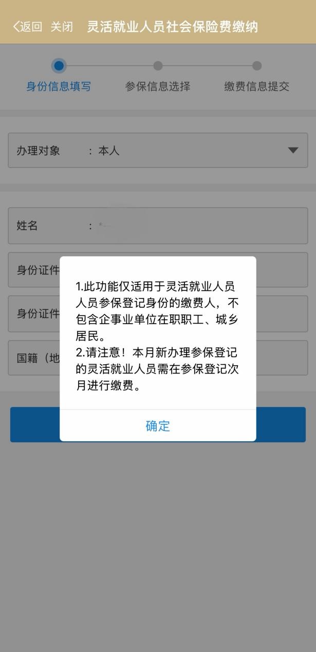 ①登录随申办App后,在“首页”上方菜单栏选择“推荐”,下拉至“精选主题”模块,点击“社保缴费”,进入个人社保缴费专区,下拉至灵活就业服务专区,“灵活就业人员社会保险费缴纳”,页面跳转后提示该功能模块适用人员范围,点击“确定”,进入身份信息填写。