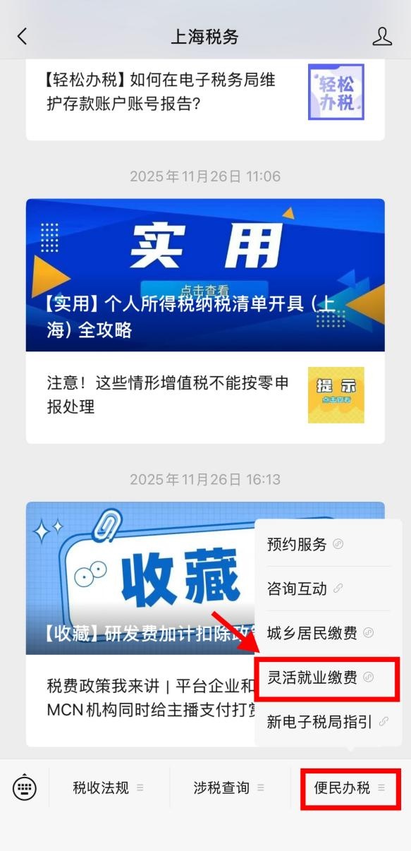 进入上海税务微信公众号,点击“便民办税”,选择“灵活就业缴费”,即会跳转至随申办小程序灵活就业人员社会保险费缴费页面。