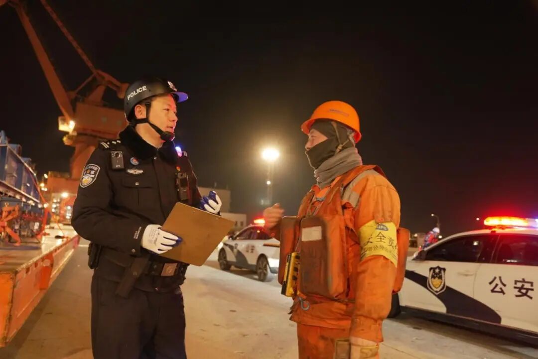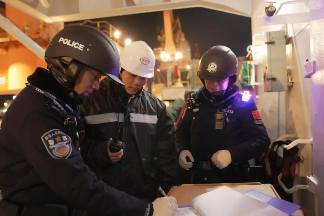 近日晚间,上海港吴淞口岸的码头灯火通明,载运了近一船纸浆的“中远海运荣耀”轮,缓缓靠泊罗分码头5号泊位。红蓝交替闪烁的肩灯在边检民警的肩头格外耀眼,精神抖擞的他们早已等候在此,保障这批重点物资的抵达转运。