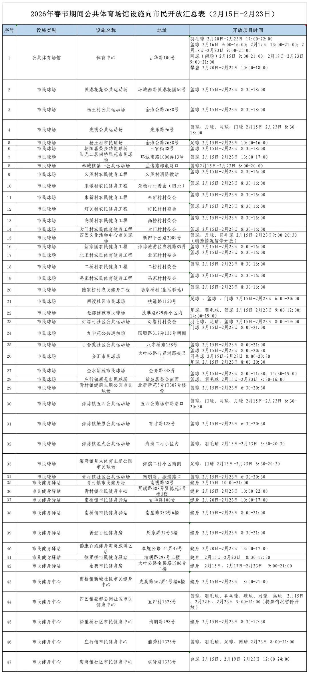 为进一步贯彻落实国家体育总局印发的《公共体育场馆基本公共服务规范》要求,广泛开展节假日全民健身活动,现将2026年春节假期期间奉贤区公共体育场馆设施开放信息公布如下,请广大市民提前安排好锻炼时间。 (点击图片查看表格)
