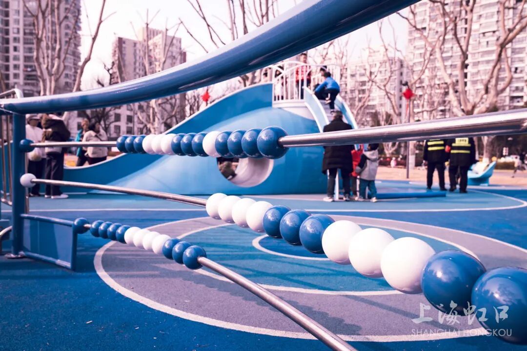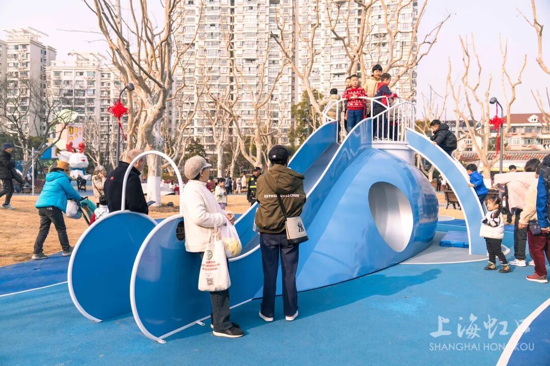 在公园的儿童乐园区域,一座蓝色鲸鱼造型的大型无动力滑梯成为孩子们的“新宠”,结合周边的攀爬网、摇摇乐等设施,构成了一个充满趣味的游乐空间。