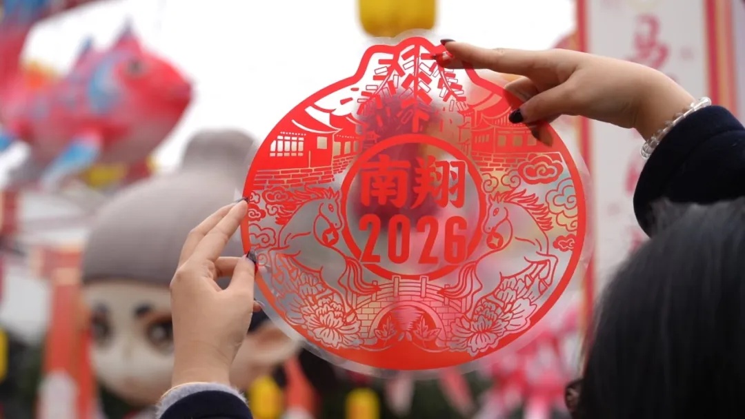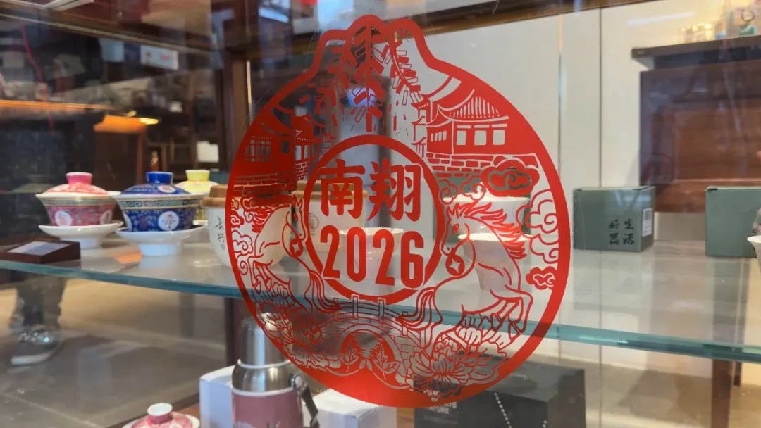还未踏入游客服务中心,目光便已被门扉上新贴的非遗剪纸窗花牢牢吸引——南翔小笼轮廓中,“2026”与“南翔”字样精巧嵌合,几串鞭炮在顶端炸开红火年意。两匹对称的骏马,正踏过天恩桥,身畔环绕钱币、花卉等细巧纹样。一笼一世界,南翔十八景的雅致与马年的奔腾气象,就这样被红纸轻轻“收”了进去。