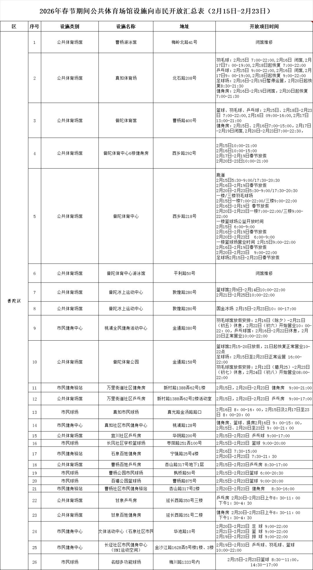 普陀体育中心的跑道和室内球场在2月16日至19日(除夕至初三)整体放假,但2月20日(初四)起便恢复正常分时段开放。