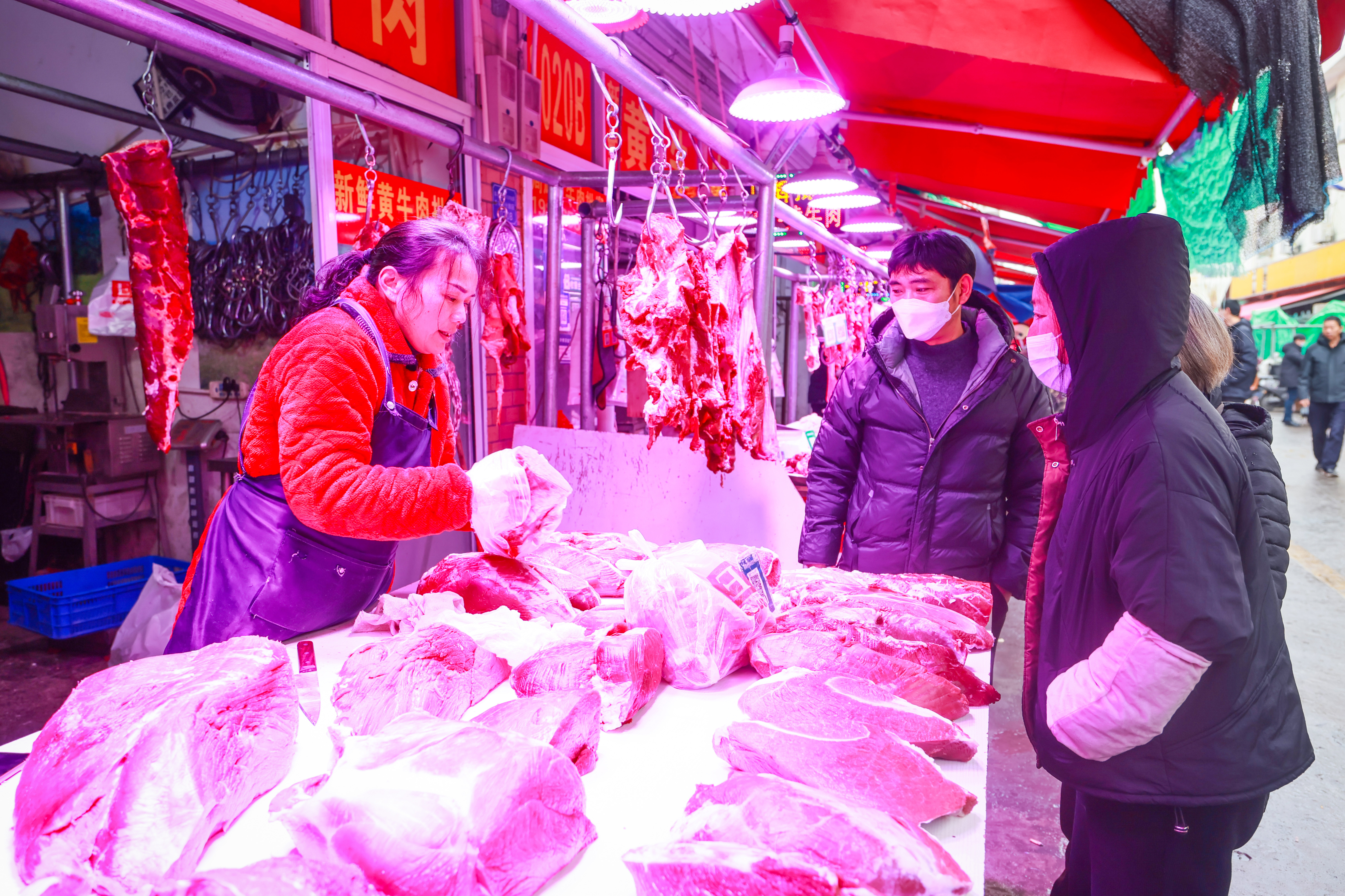 肉摊前顾客络绎不绝