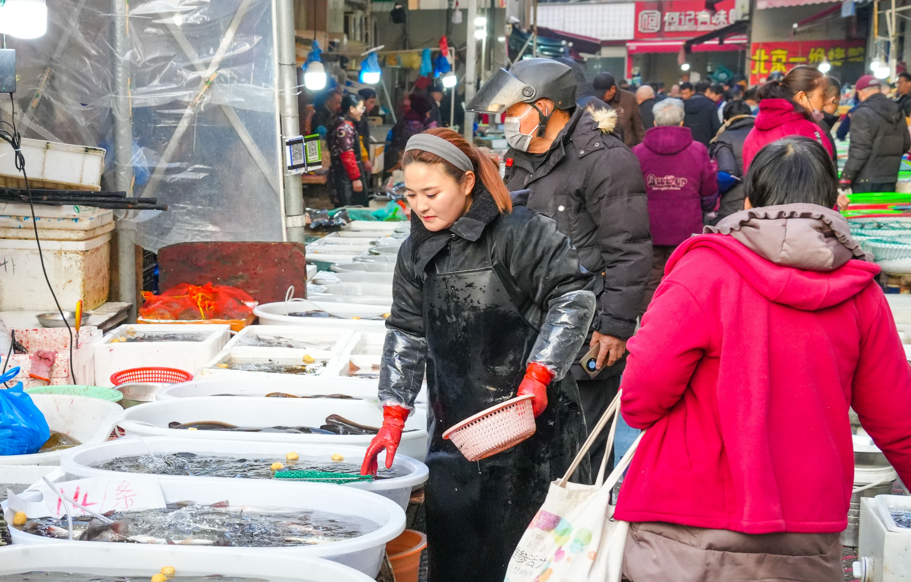 市民在鱼摊前选购,打算为春节家宴增添一道佳肴