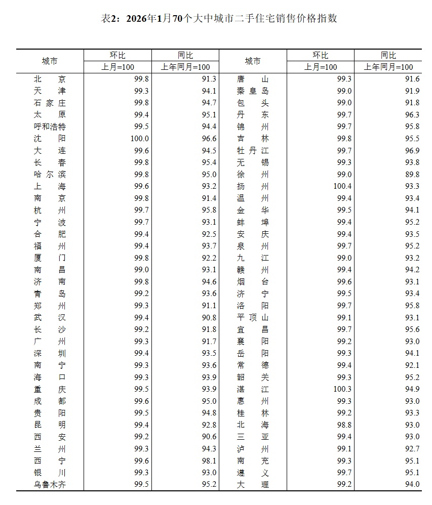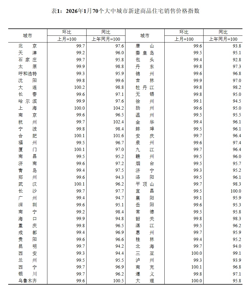2026年1月份,70个大中城市商品住宅销售价格环比降幅总体收窄、同比下降。