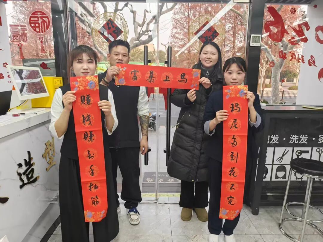 街道居民、快递外卖骑手们围在长桌旁,商户写“福”,骑手晒“福”,居民接“福”。一位美团骑手接过商户手写的“马年大吉”春联,笑着说:“这是我今年收到的第一份年味,希望新的一年能平安,也能爆单。”