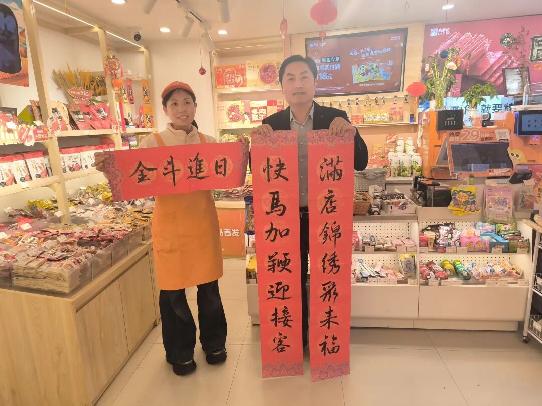 墨迹未干,这份沉甸甸的温情已在路上。活动结束后,各街区党支部即刻开启新春走访行动。四位街区党支部书记带着现场书写的春联福字,走进康健大街小巷,叩开一家家新兴领域商户的门。