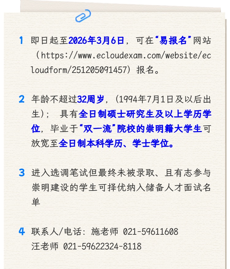报考上海市崇明区2026年度选调生招录计划,进入选调笔试但最终未被录取、且有志参与崇明建设的学生可择优纳入储备人才面试名单。