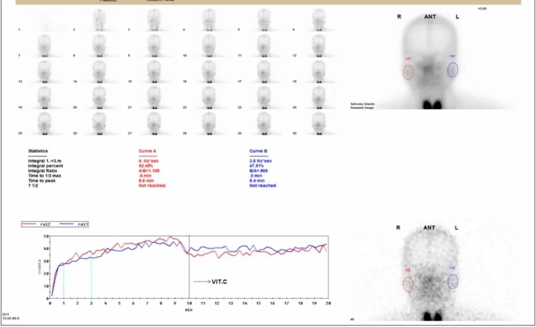 来到核医学科后,这位患者很快完成了唾液腺动态显像检查:从躺在检查床上注射显像剂,到结束检查离开科室,全程仅用了半个小时,过程简单无痛苦,期间医生还让她含服了一片维生素C片,目的是刺激唾液分泌,更精准判断唾液腺功能。而这份检查报告,也成为了确诊疾病的关键线索。