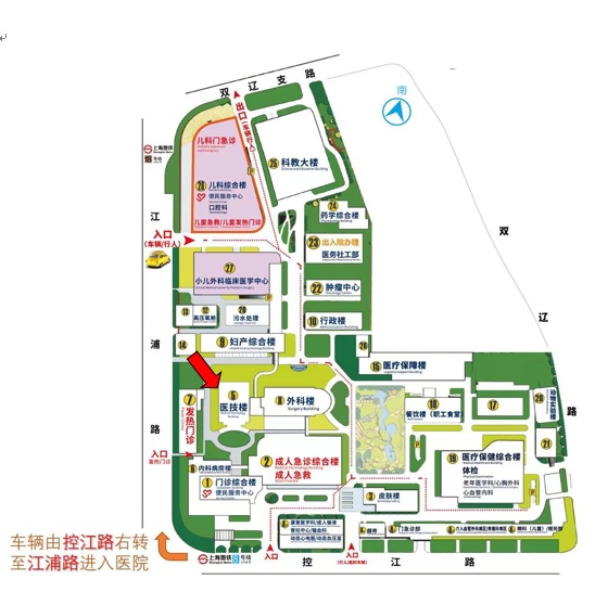 上海交通大学医学院附属新华医院核医学科位于医技楼(5号楼)6-7楼(下图红色箭头指示位置),7楼为PET/CT中心。