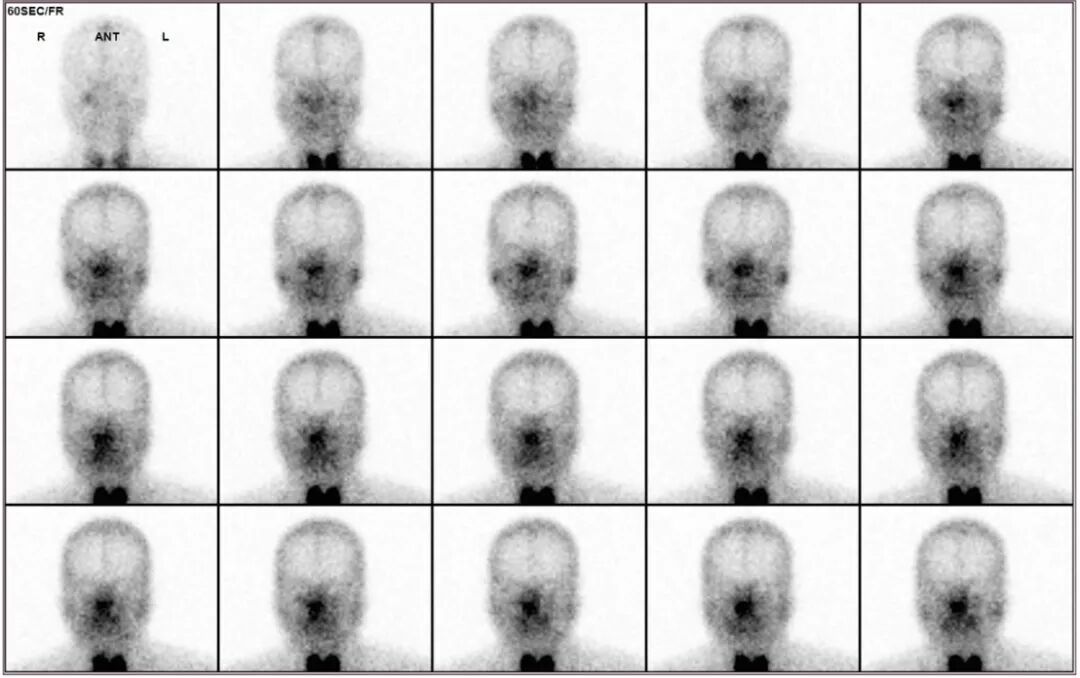 唾液腺是人体口腔内分泌唾液的腺体,包括腮腺、舌下腺、颌下腺,人每天可分泌约1-1.5升唾液,帮助人体湿润口腔、消化食物、抗菌护齿。唾液腺小叶内导管上皮细胞可以摄取和分泌99mTcO4-(高锝酸盐),静脉注射该显像剂后随血液被小叶内导管上皮细胞摄取和积聚,并在一定的酸性物质(维生素C片)刺激下迅速分泌出来,随后排泄到口腔内。自注射显像剂即可开始的连续时间点采集图像,最终获得唾液腺动态显像。通过唾液腺动态显像,可以了解两侧唾液腺的摄取和排泌功能。