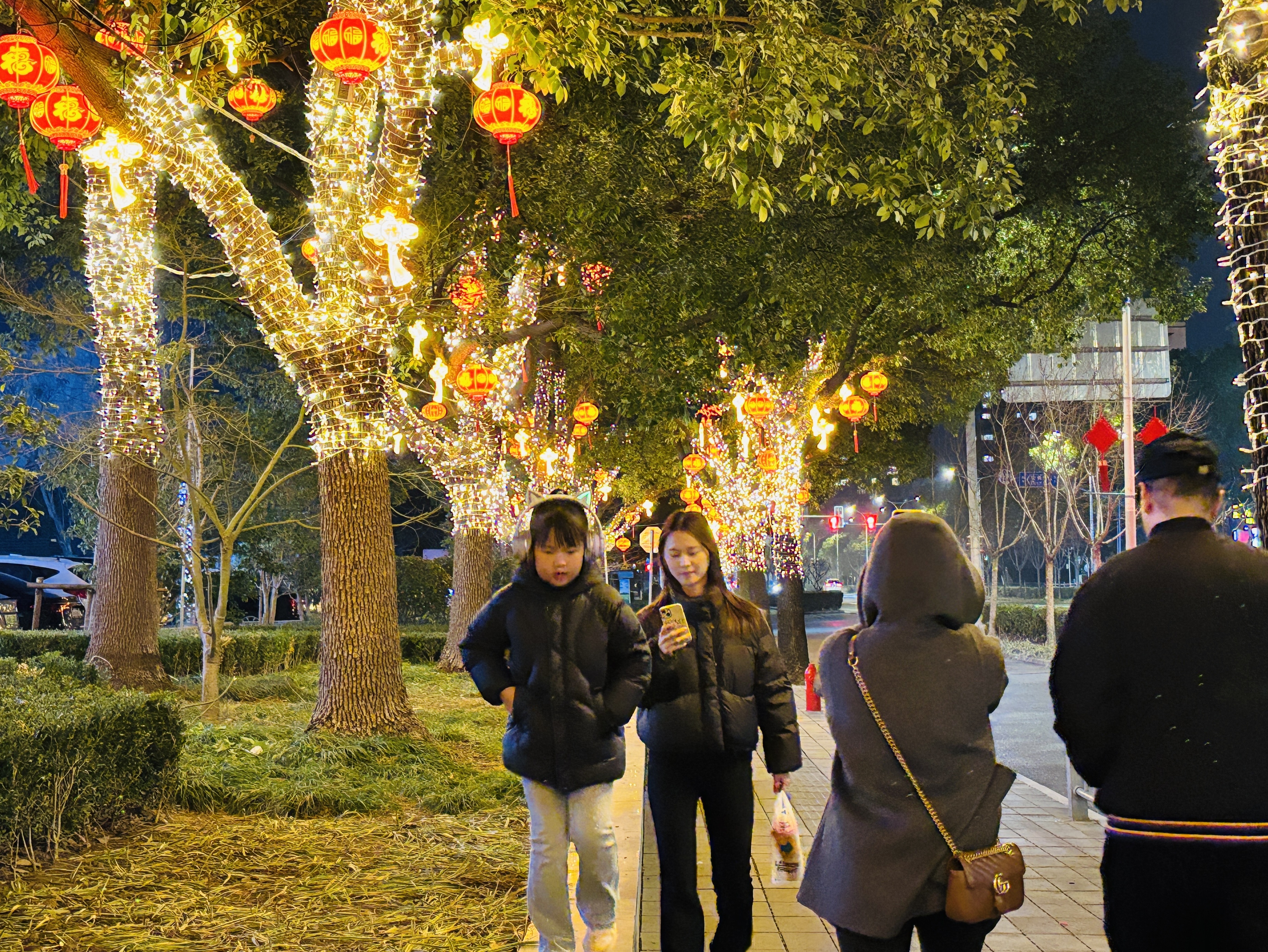 经过近一周的设计与安装,方松街道春节灯光氛围于2月12日晚正式亮起:部分沿街树干缠绕灯串,红灯笼高挂枝头,“福”字中国结随风轻摆,喜庆气息在夜色里铺展开来。
