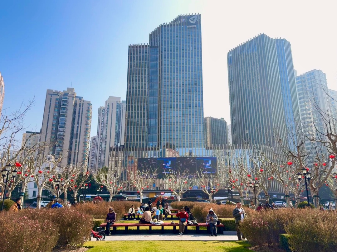 今日申城碧空如洗,暖阳倾洒,体感温暖宜人。上午十时许,徐家汇书院广场上,遒劲的树木枝干间,红灯笼高挂,与湛蓝天空相映成趣。广场一隅的马形艺术装置吸引众多游客驻足留影,新春氛围浓厚。不少市民趁晴好天气走出家门,有的三五结伴闲坐长椅,沐浴阳光、话起家常;有的带着孩子在广场上追逐嬉戏。不远处传来悠扬的小提琴旋律,为这份轻松喜悦的新春图景添上诗意。