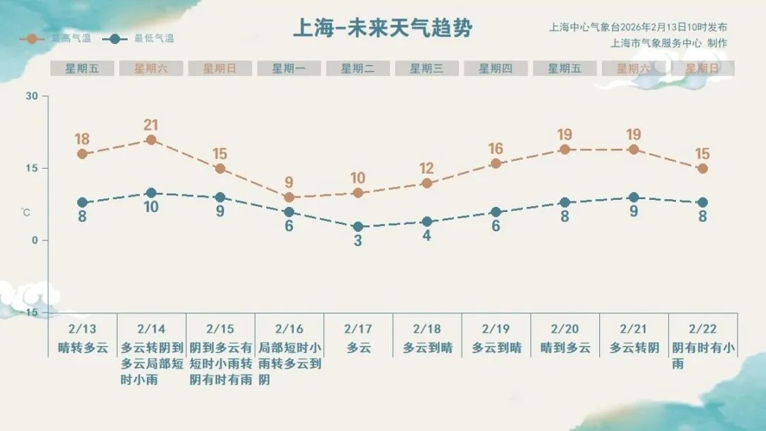 上海中心气象台预报员王琴说:“受暖气团影响,明天本市以多云天气为主,气温回升明显,最高可达21℃。周日天气形势较近期有所调整,白天降水较弱,午前最高气温仍有15℃,下午起受冷空气影响,风力增大,降水趋于明显。”