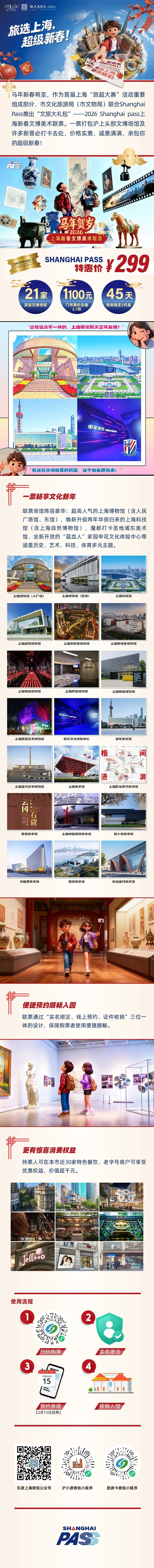 马年新春将至,作为首届“旅超”大赛的重要成果和产品,上海市文化旅游局(市文物局)联合久事集团旗下交通卡公司精心策划,首次面向市民游客推出马年贺岁“文旅大礼包”—— 2026 Shanghai Pass 上海新春文博美术联票。低至299元的优惠价格,囊括了票面总价值超1100元的上海20余家热门文博美术场馆的入馆门票、热门展票,更有大量优惠权益和商圈礼遇折扣。