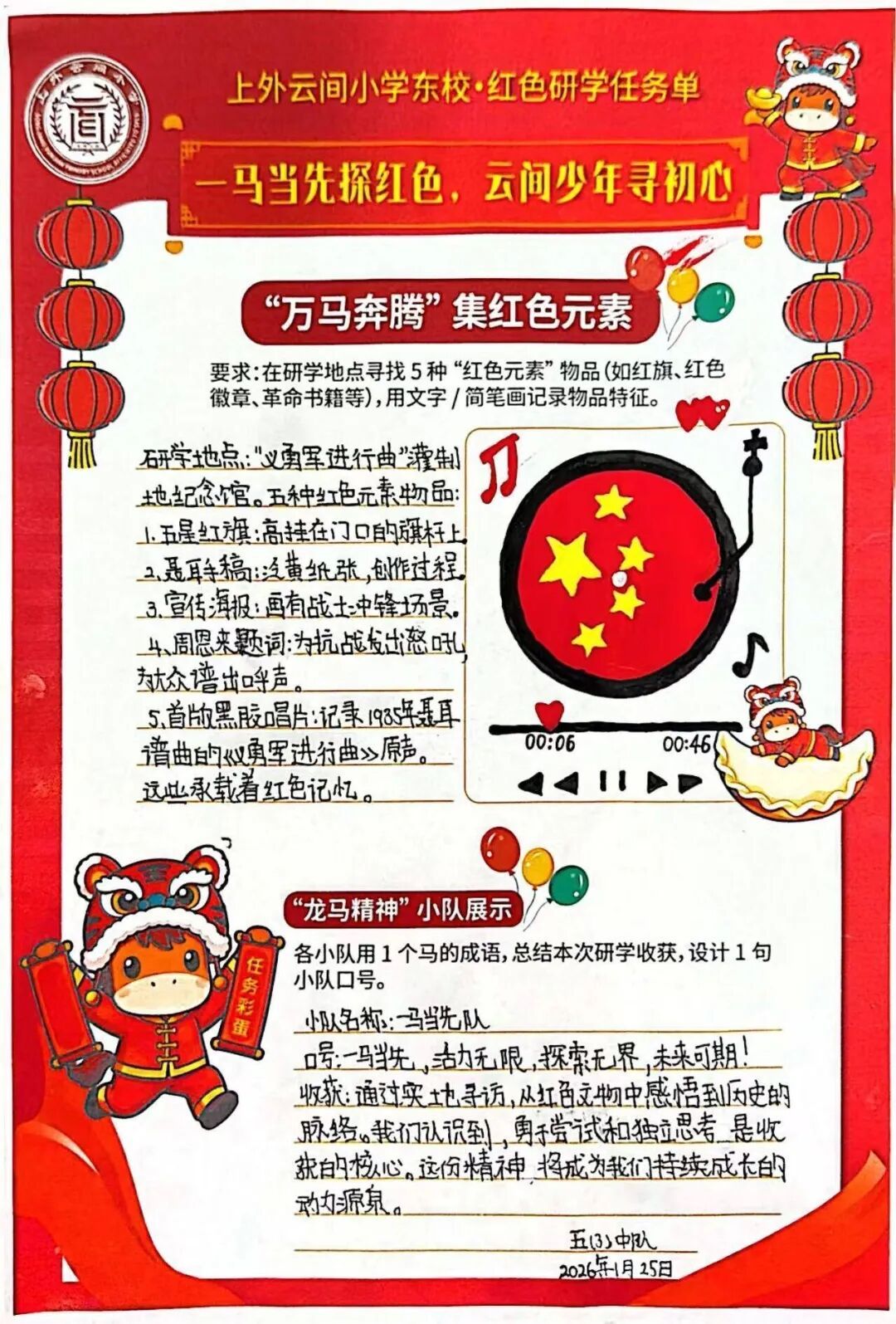 上外云间小学东校组织少先队员开展“打着队旗去考察” 红色研学活动。队员们化身“小马驹”,搜寻红色标语、聆听英雄事迹、收集红色元素,沉浸式感悟革命精神,立志争做新时代接班人,让红色基因扎根心底,为成长注入奋进力量。