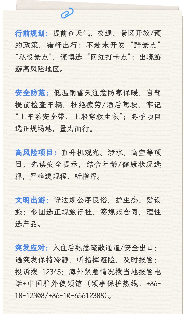 做好行前规划,合理安排行程。春节假期出行集中,请提前关注途经地和目的地天气、交通状况及景区开放时间、门票预约政策。合理规划旅游线路,尽量错峰出行,避免前往人流密集区域;不前往未开发开放、缺乏安全保障的“野景点”“私设景点”,谨慎选择“网红打卡点”。出境游客请密切关注目的地安全形势,避免前往高风险地区。