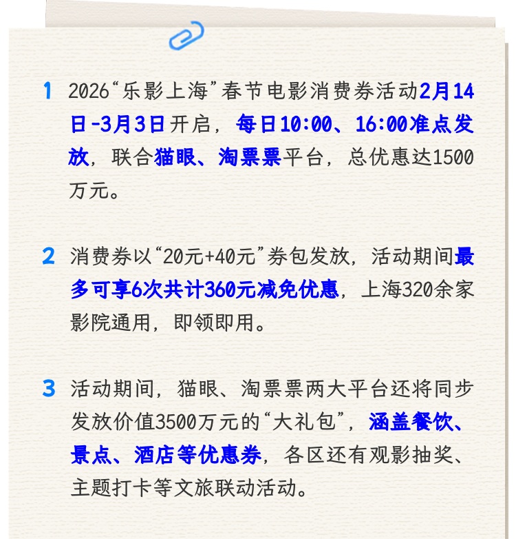 欢欢喜喜看电影,热热闹闹过大年。2026春节档《飞驰人生3》等多部大片即将上映。市委宣传部(市电影局)从2月14日起,联合猫眼、淘票票两大平台推出2026“乐影上海”春节消费券活动,每日上下午准点发放,领取方式简单快捷,最高可享6次共360元优惠,活动总金额达5000万元,诚邀全市人民一起乐惠看电影。
