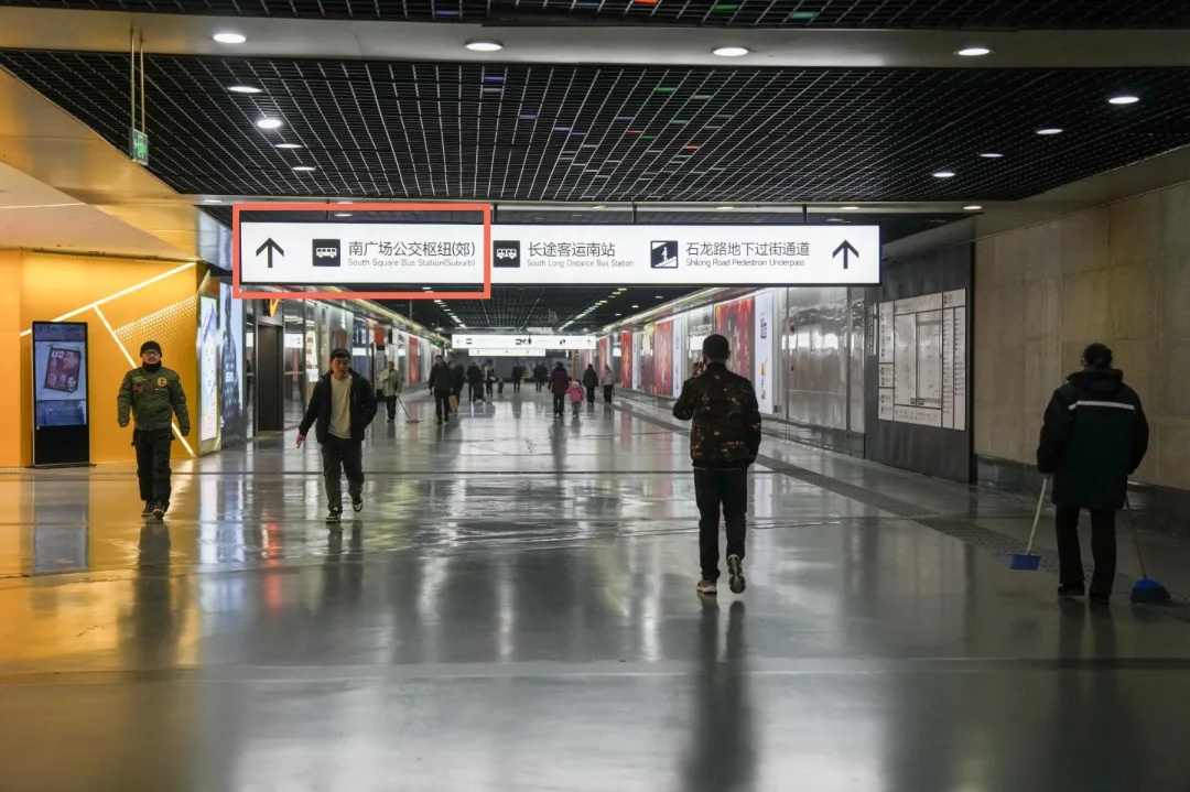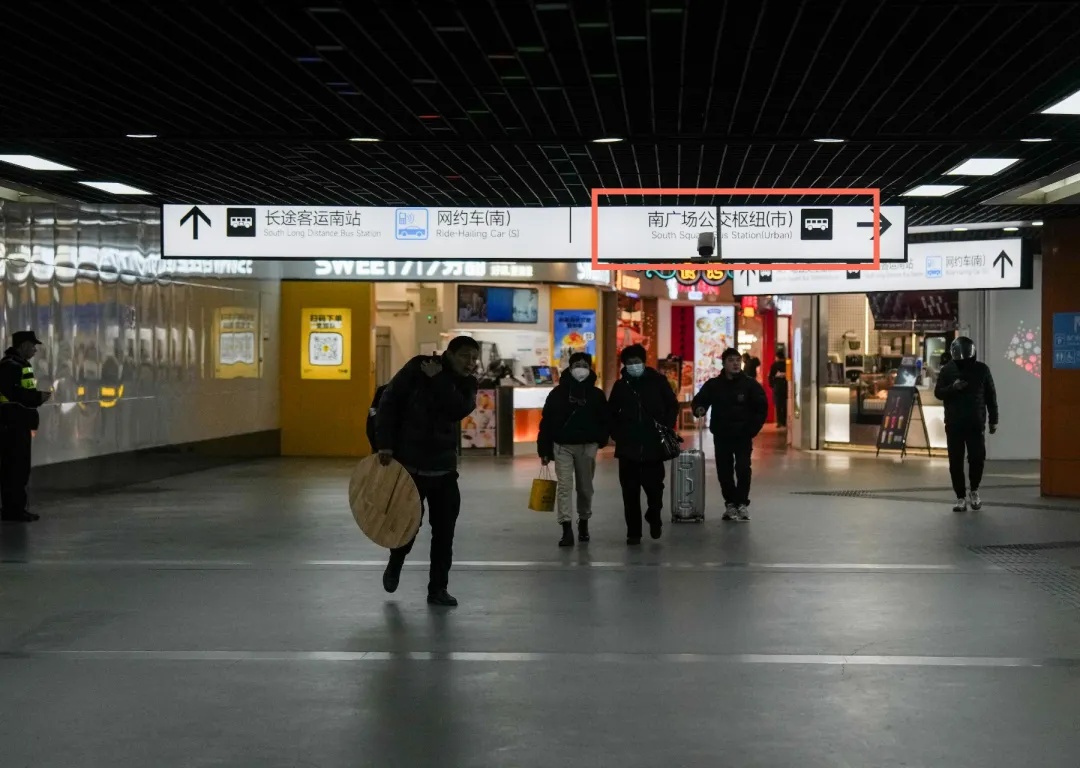 前往南广场公交枢纽(郊)乘坐公交的旅客,可选择东南出站口出站,进入南广场地下通道,按标识步行,上楼至地面,即可抵达南广场公交枢纽(郊)。