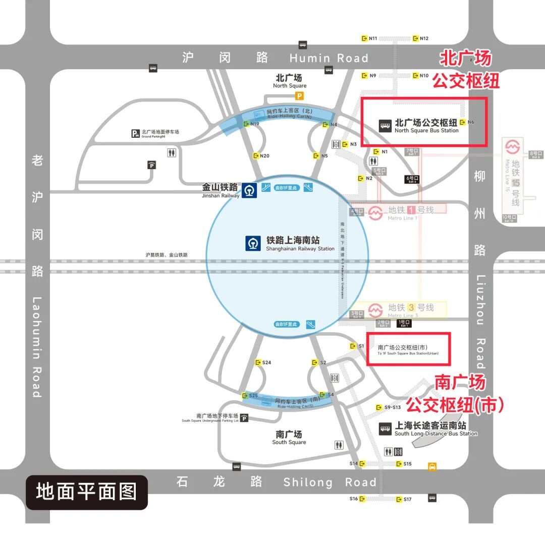 上海南站南广场设有南广场公交枢纽(市)和南广场公交枢纽(郊),前往南广场公交枢纽(市)乘坐公交的旅客,可选择东南出站口出站,进入南广场地下通道,按标识右转乘坐扶梯,即可抵达南广场公交枢纽(市)。