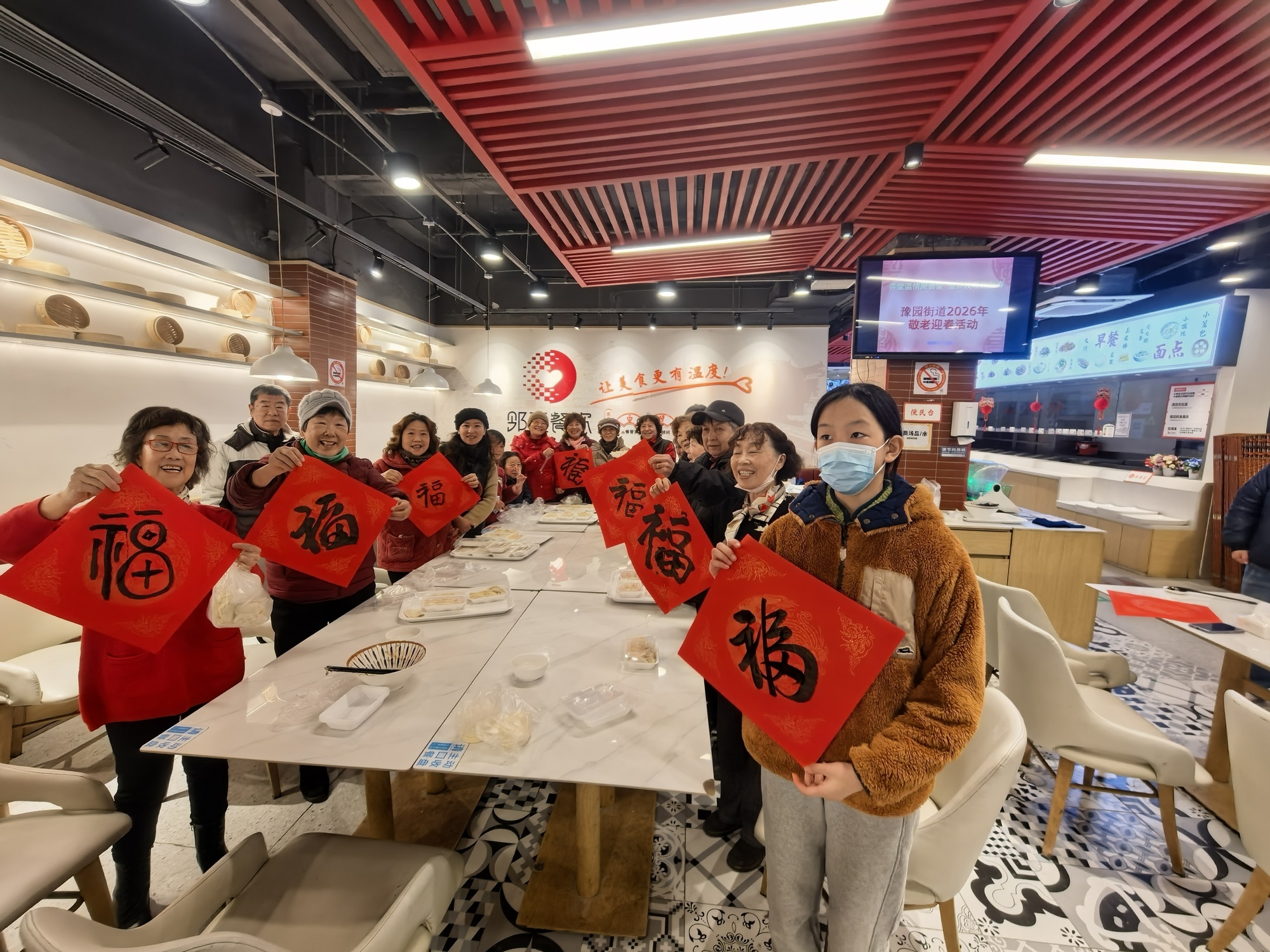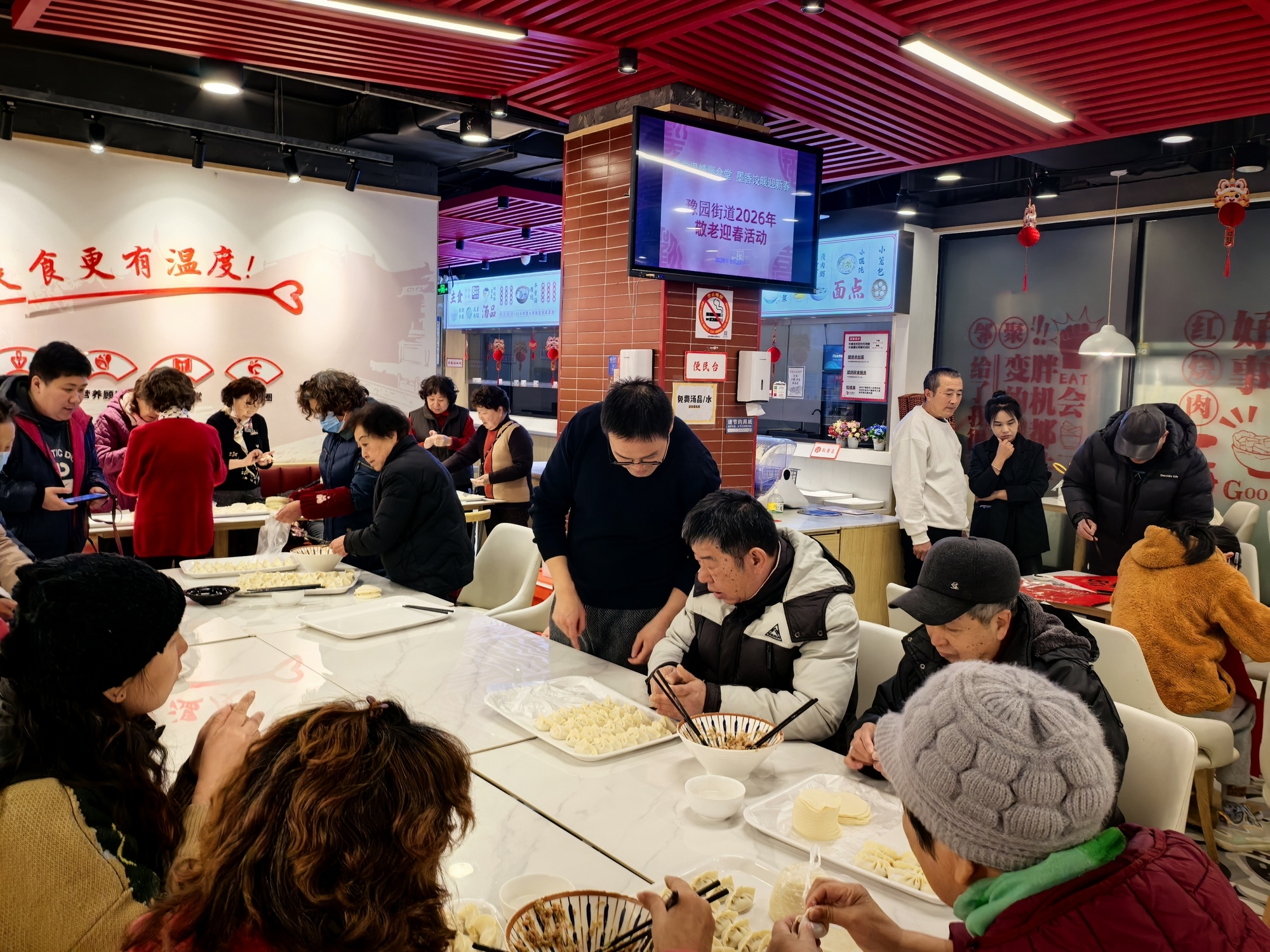 活动现场针对新就业群体,食堂精心筹备迎新联欢与专属福利,幸运抽奖送上餐饮免单券,特惠套餐驱散寒冬凉意,愿奔波的骑手们新岁龙马精神、一路平安。敬老活动中,老人们欢聚一堂,包饺子、写春联,在动手时感受传统年味,也在邻里相伴中驱散孤单,续写温情。