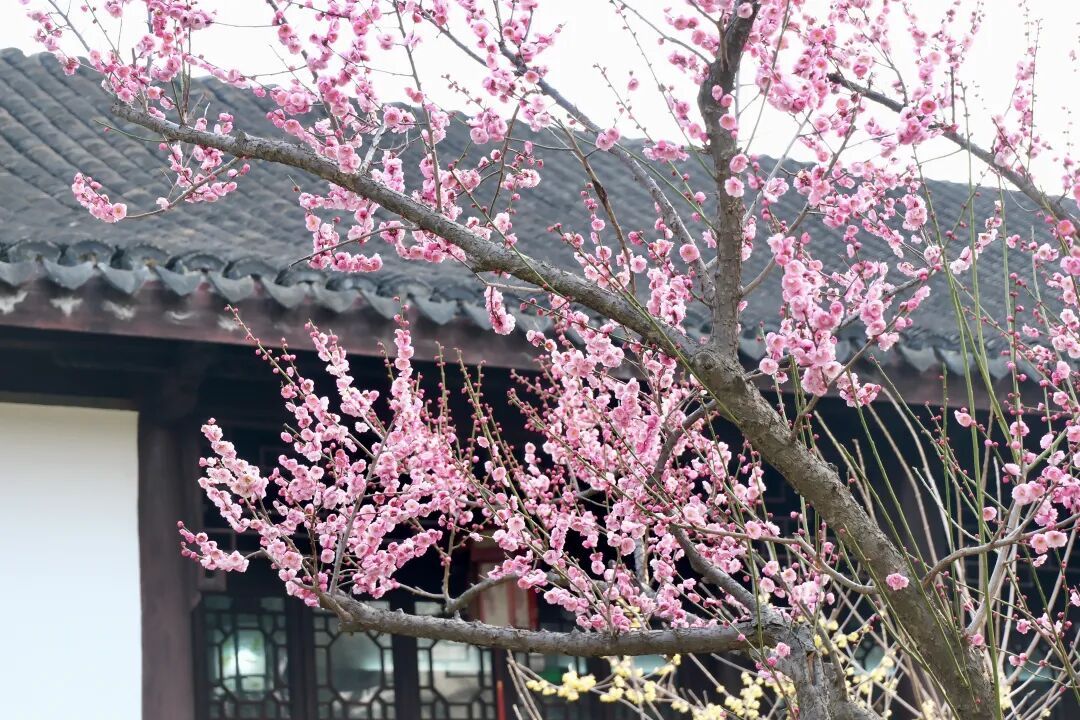 目前,古猗园约有三成梅花已跃上枝头,它们或三两簇拥,或独自绽放,与周围古色古香的亭台楼阁互相映衬,美得典雅、宁静、明洁。其中,小径边一株粉白相间的跳枝梅花开正艳,吸引了不少游客打卡。