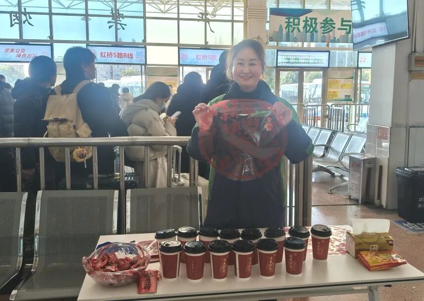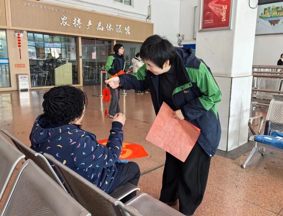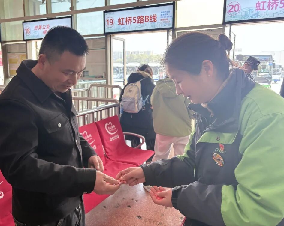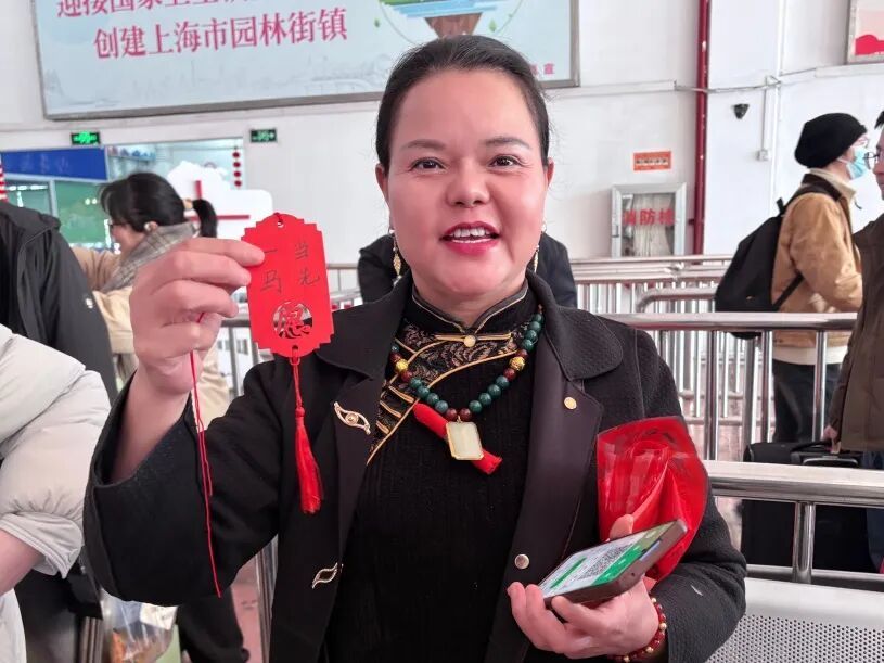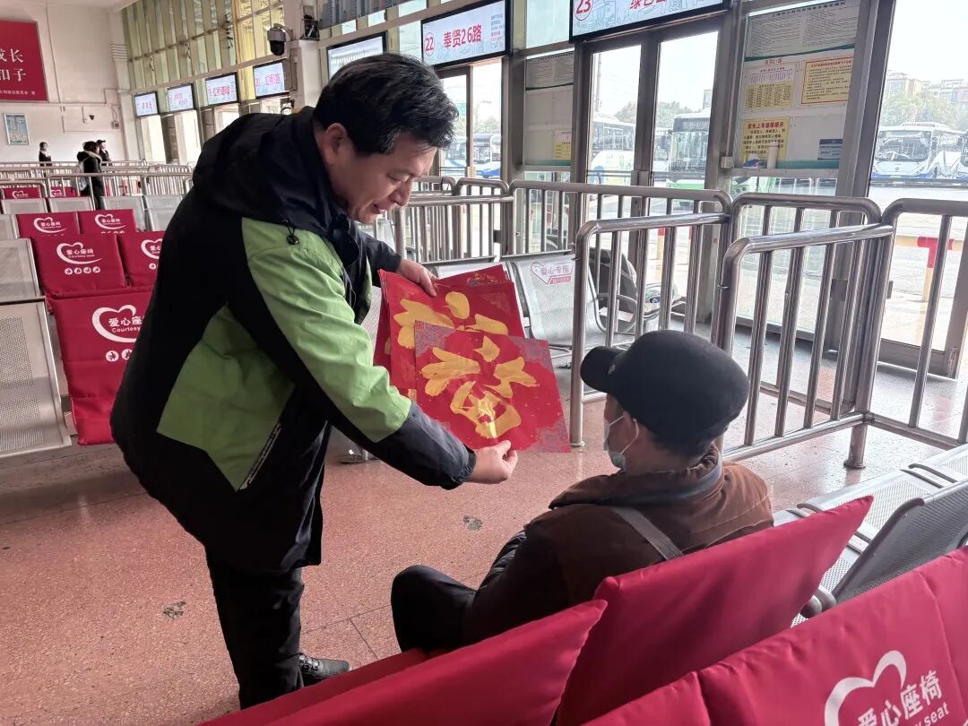 把春联送到乘客手上,回家的路带着墨香。有位老者挑了张“福”字,笑着说要贴在家门口第一眼能看到的地方。