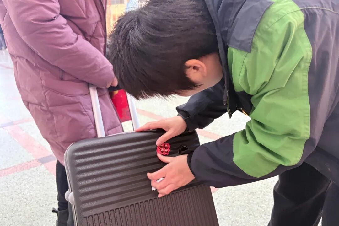 行李箱、编织袋、背包……每贴上一张,就像寄出一份小心意。“马上福来”“马上开心”“福气满满”——愿这些马年祝福,跟着你一起到家。