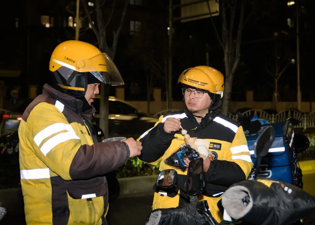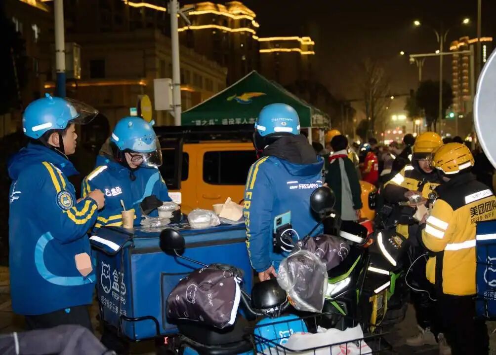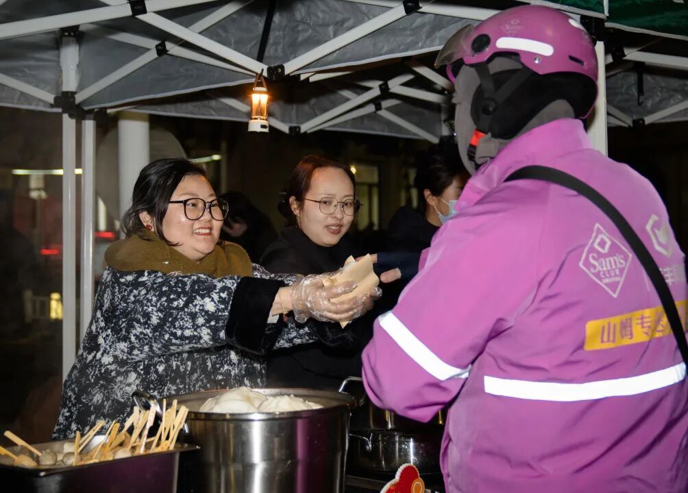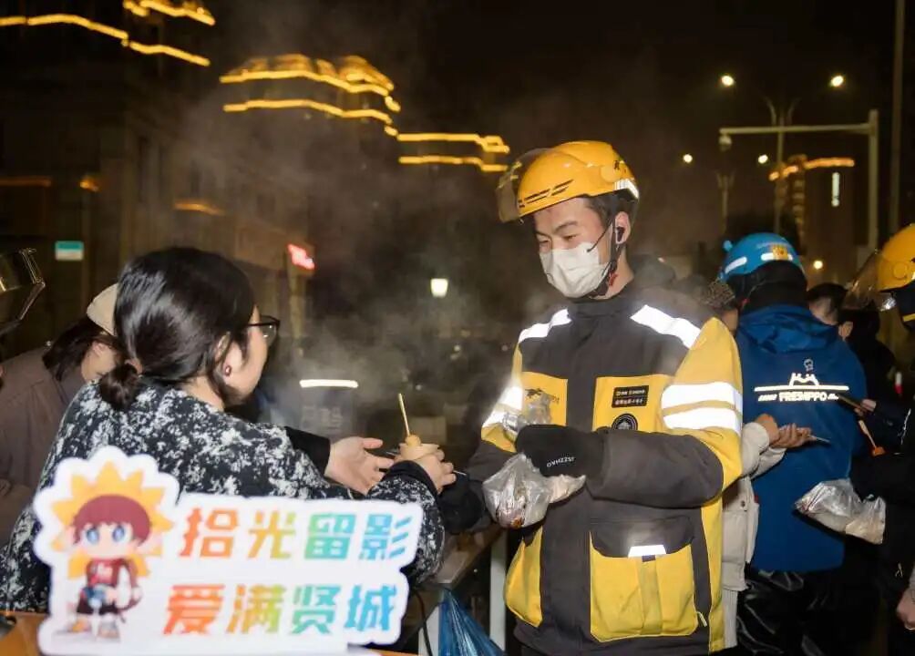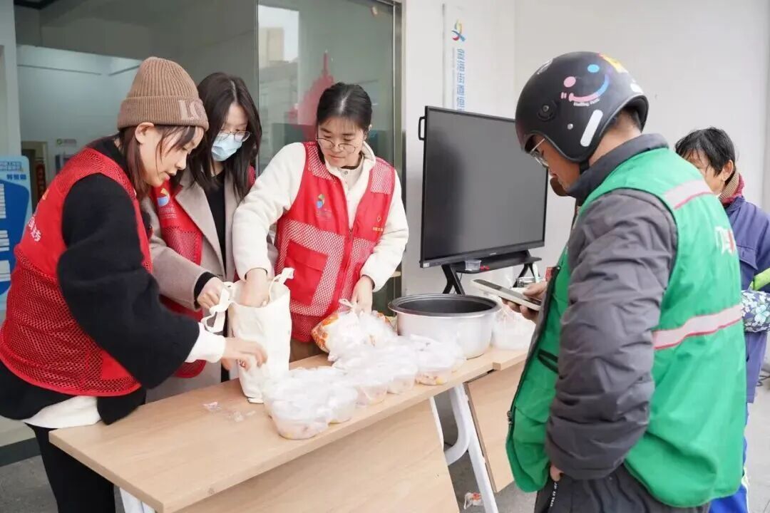 夜幕降临,华灯初上,春节期间的外卖骑手们分外忙碌,有时来不及吃一口热饭。金海街道“拾光”志愿服务团队此时行动起来,在外卖骑手集中区域设置流动服务点,为奔波一天的他们送上热腾腾的暖餐。活动现场也设立了互动环节,邀请外卖小哥分享自己的工作经历和心得,增进彼此了解与尊重。这已经是“拾光”志愿服务团队连续第五年开展“你送餐,我送暖”志愿服务,让夜晚的城市多了几分温情。
