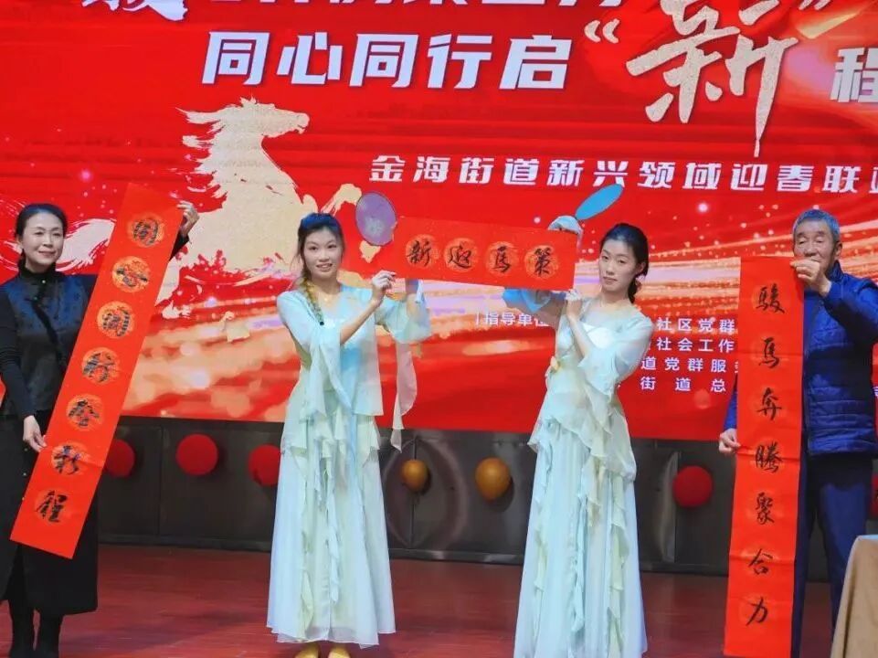 为让留奉过年、坚守岗位的新就业群体感受到节日氛围与归属感,金海街道于春节前夕举办“骏马奔腾聚合力,同心同行启‘新’程”主题联欢会。活动特别邀请了辖区内新就业群体代表共同参与,共享团圆时刻。舞台上,新兴领域从业者自编自导自演,带来朗诵、小品、歌舞等节目,精彩纷呈;活动现场特别设置了集市和照片墙,成为不少亲子家庭购置年货、打卡留念、许下心愿的温暖角落。