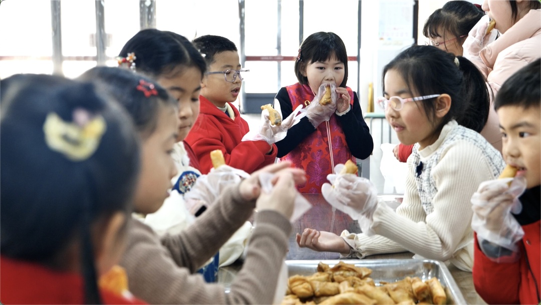 “炸好的春卷像金条,一口爆汁,热乎乎的,感觉自己做的最好吃,特别有成就感!”张曦予小朋友嘴角还挂着馅料,“通过学习,我还知道了春卷是‘卷’来好运的意思,今年过年我要跟爸爸妈妈一起做,祝他们运气爆棚,旺旺旺!”