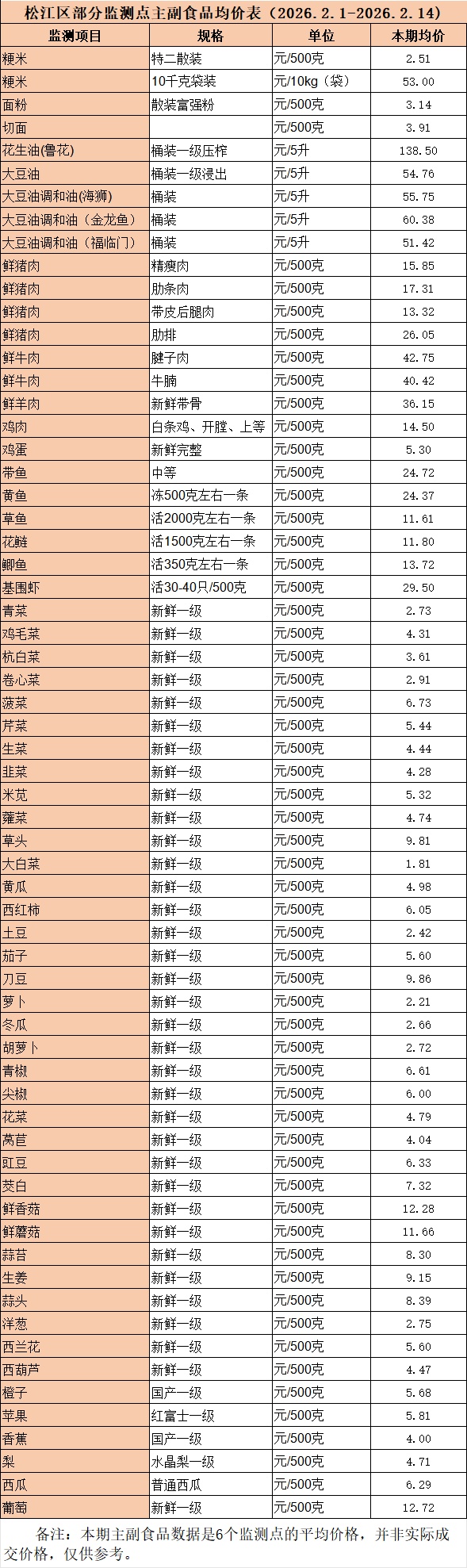 松江区部分监测点主副食品均价表(2026.2.1-2026.2.14)