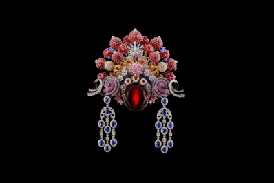 刀马旦最具识别性的头面元素——七星额子,以密集而严谨的宝石布局加以呈现:总重92.42克拉的1193颗红宝石以圆形、椭圆、马眼、公主方、水滴切面等各种形态交错镶嵌,模拟戏曲头饰中流苏、绒球、簪花等物件,玲珑有致,富于动感和层次;大量钻石、粉色蓝宝石和蓝宝石装饰于“盔头”与“额头”,营造出华丽而张扬的戏曲舞台效果;“盔头”两侧的流苏是源自装饰艺术风格的可拆卸吊灯耳环。