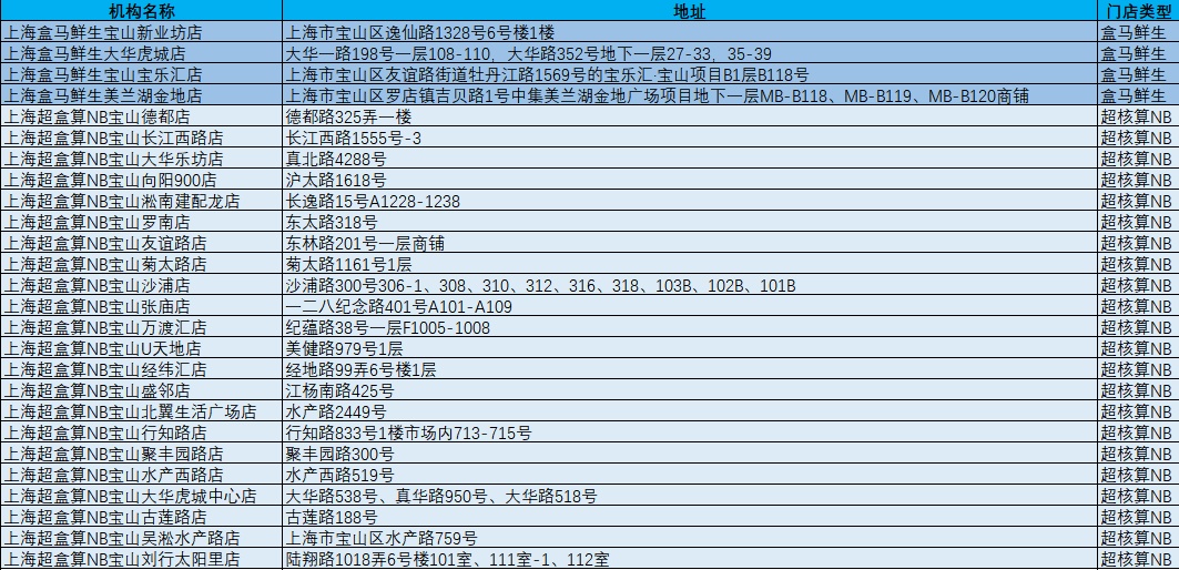 宝山区内各盒马门店点位