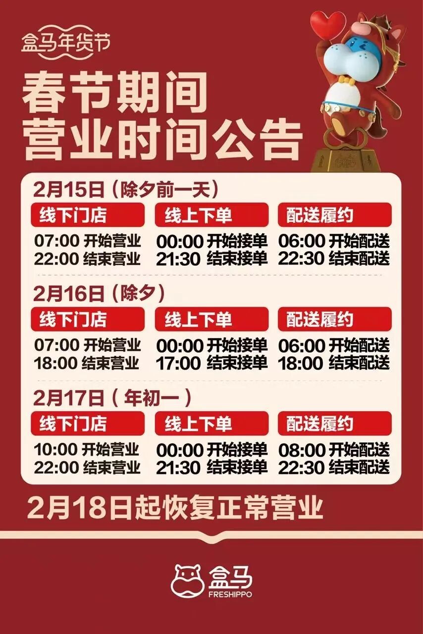 今年春节,盒马将用实实在在的货品、稳稳当当的服务,守护每一顿团圆饭。上盒马,为新年加码——这份年味,就在手边,愿大家在新的一年里,吃得新鲜、过得温暖、团圆美满!