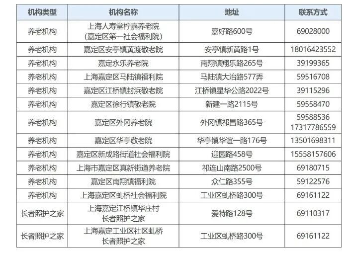 嘉定区“暖心短托”服务机构名单
