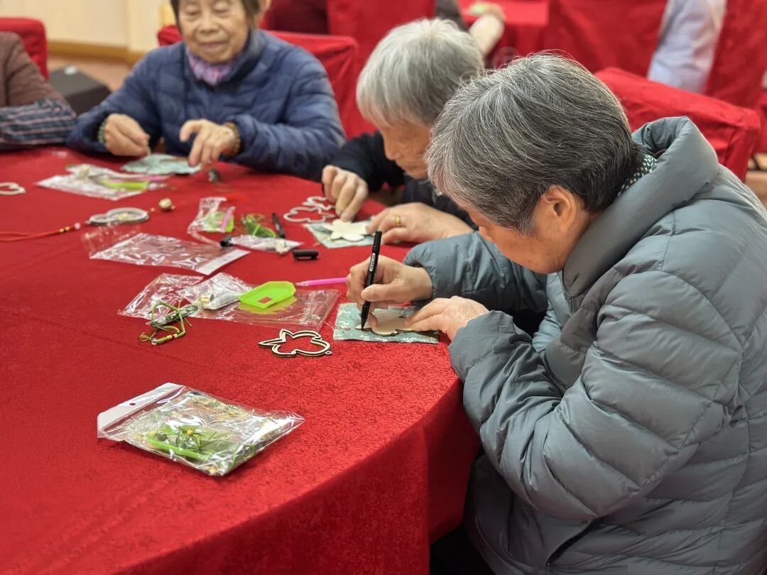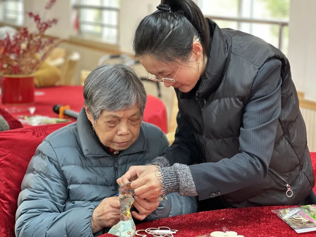 “这里环境干净、人多热闹,很开心的。”舒阿婆说起院里的生活,话匣子一下打开,“每天最期待的还是不重样的文娱活动——手工、看电影、做早操,生活规律又很充实。”说着,她从床头柜里翻出几件手工作品,“喏,短短几天已经做了好多个摆件。年味比往年还来得更早一些,更浓一些。”