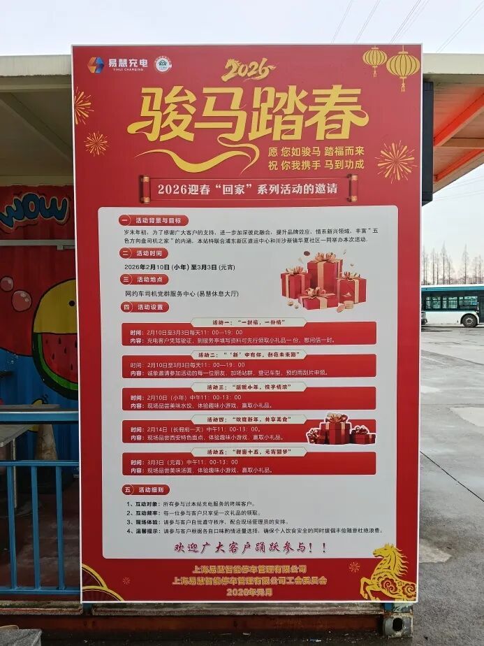 这个充电站也是浦东新区为出租车、网约车驾驶员们打造的暖心驿站之一。为让司机师傅们感受节日的温暖与关怀,在浦东新区建设和交通委员会的指导下,浦东三处“驿路暖心港”共同拉开了浦东新区司机之家2026年“回家”系列迎春活动的序幕。