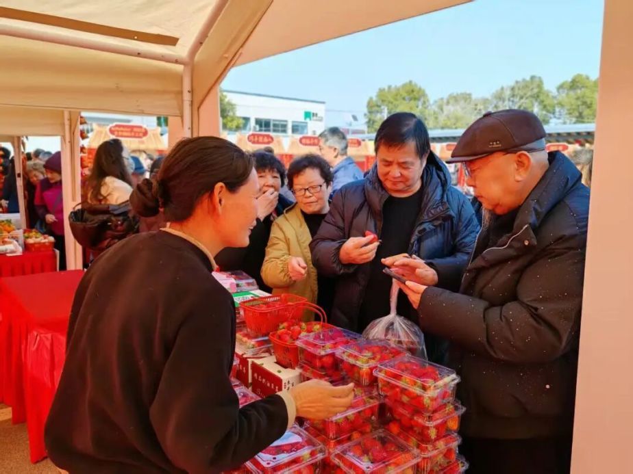 年货摊同样人气十足。本地矮脚青、章姬草莓、红美人柑橘等地产农产品新鲜满筐,走油肉、八宝饭等传统年味琳琅满目,村民游客纷纷举起手机记录。