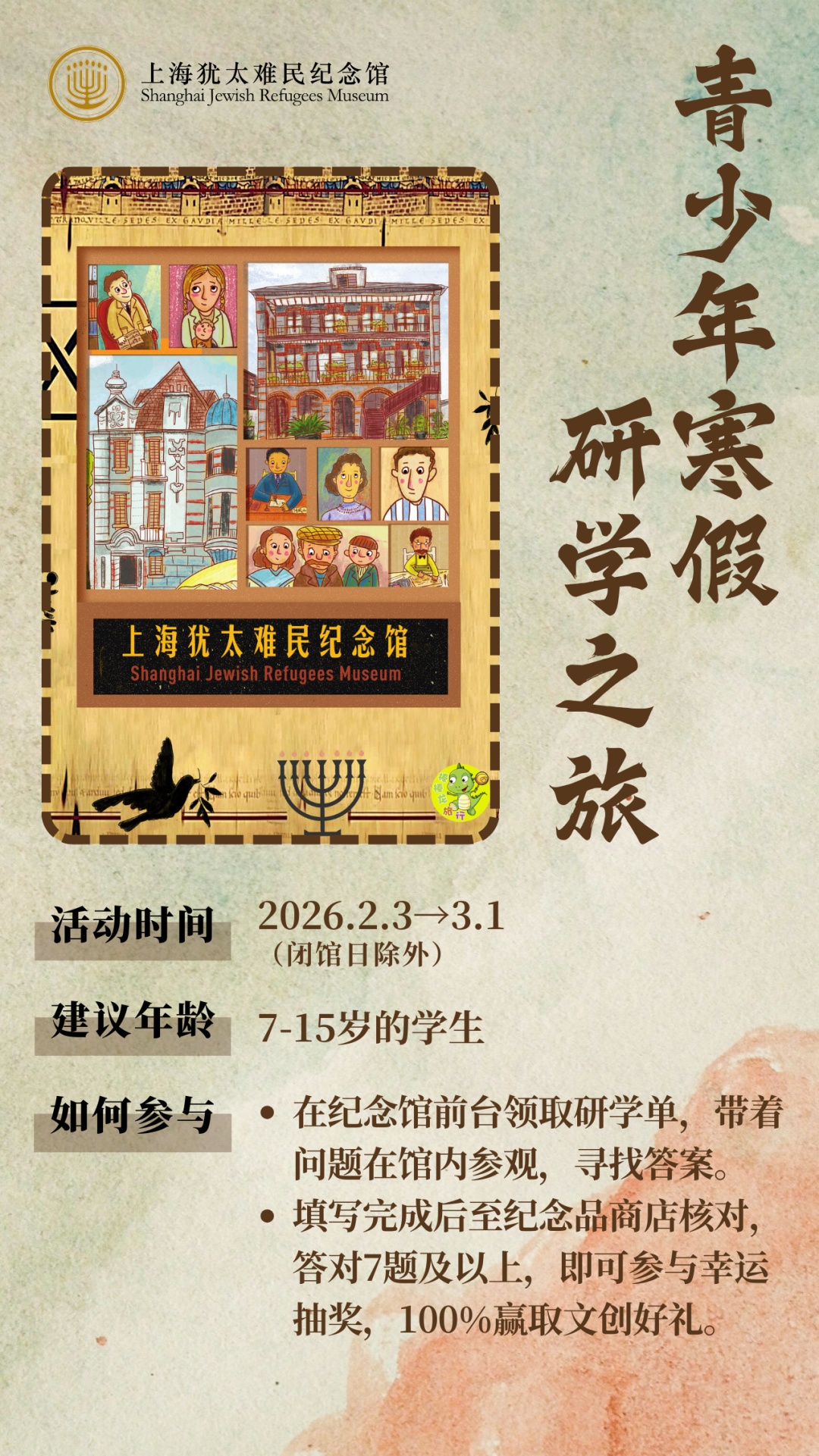 2026年春节假期,上海犹太难民纪念馆在2月15日至2月18日闭馆,2月19日至2月23日正常开放,开放时间为9:00-17:00(16:00停止售票及入场)。 The Shanghai Jewish Refugees Museum will be be closed from Feb. 15 (Sun) to Feb. 18 (Web), and open from Feb. 19 (Thu) to Feb. 23 (Mon) from 9:00-17:00 (no entry after 16:00). 观众朋友可通过美团点评、携程等线上平台提前购票。 For your convenience, purchasing tickets in advance from online platforms such as Meituan and C-trip is advised. 预祝大家新春愉快!马年吉祥! We wish you a happy Chinese New Year! 春节精彩活动 # 打卡有礼 活动时间 2026年2月19日(初三)—2月23日(初八) 参与方式 来馆参观的观众带话题#上海犹太难民纪念馆,在小红书/抖音/大众点评等平台发布3张纪念馆照片,即可免费领取“犹太难民与上海·提篮桥历史文化街区”打卡地图1份,至纪念品商店集章。