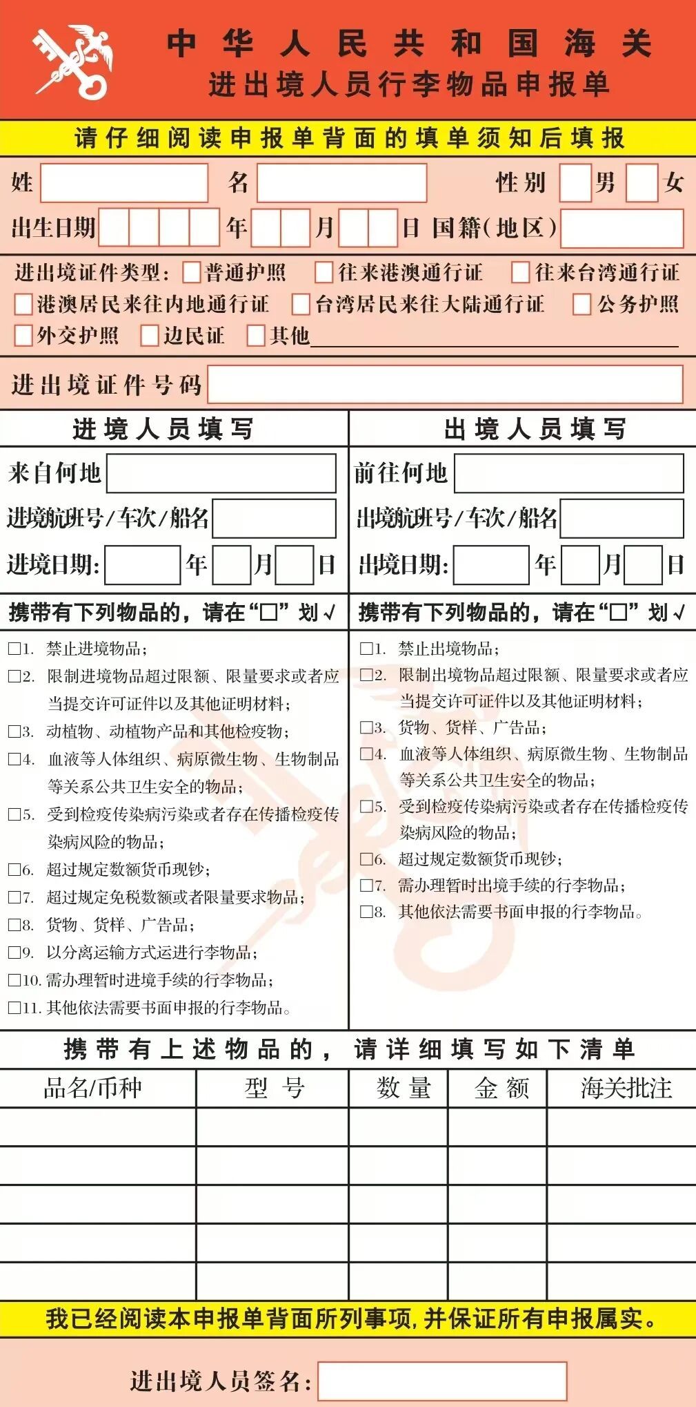 一、进出境人员携带应向海关书面申报物品的,应当填写《中华人民共和国海关进出境人员行李物品申报单》(以下称《申报单》,式样见附件)或电子申报数据,选择“红色通道”通关。