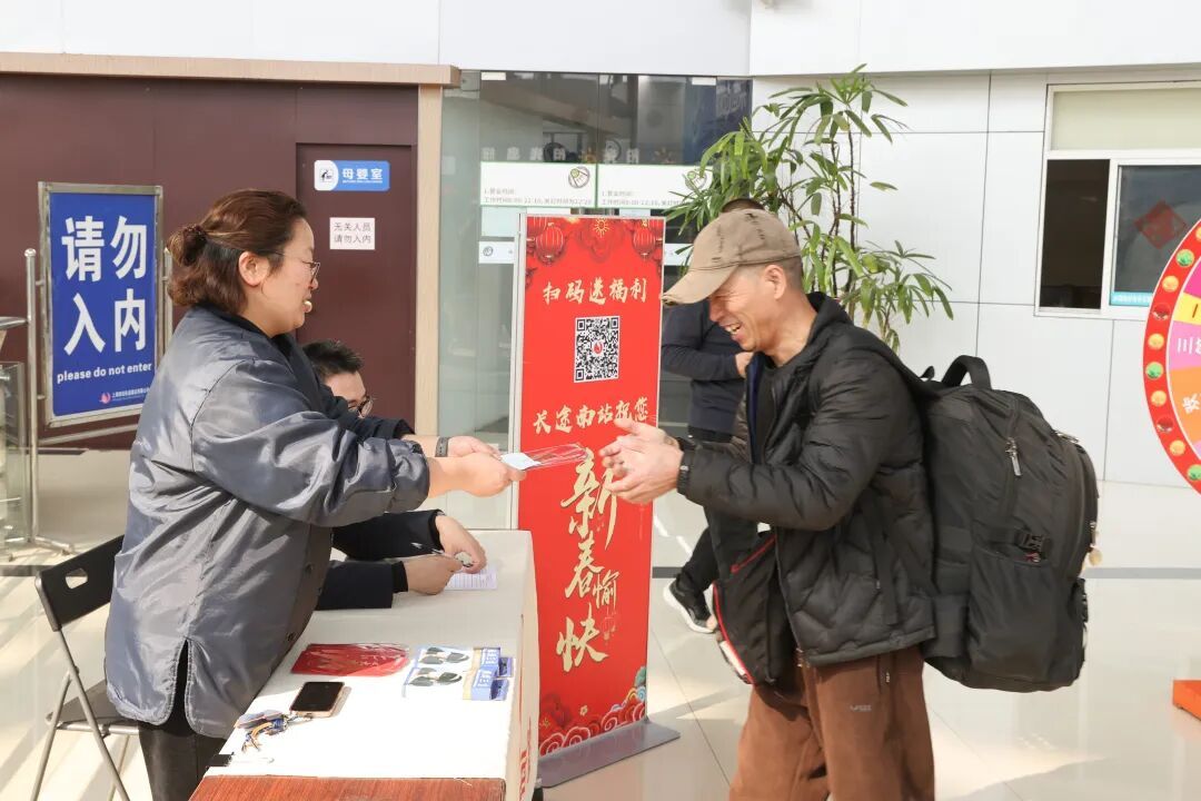 候车大厅内,旅客有序排队检票候车,行李箱与装满特产的包裹,让年味儿愈发浓厚。不少返乡旅客谈及回家,满是期待。为让旅客的返乡路更有温度,长途南站不仅推出新春转盘抽奖活动,还联合警方在候车厅开展防范购票诈骗、普及无人机禁飞政策等宣传,守护旅客财产与公共安全。