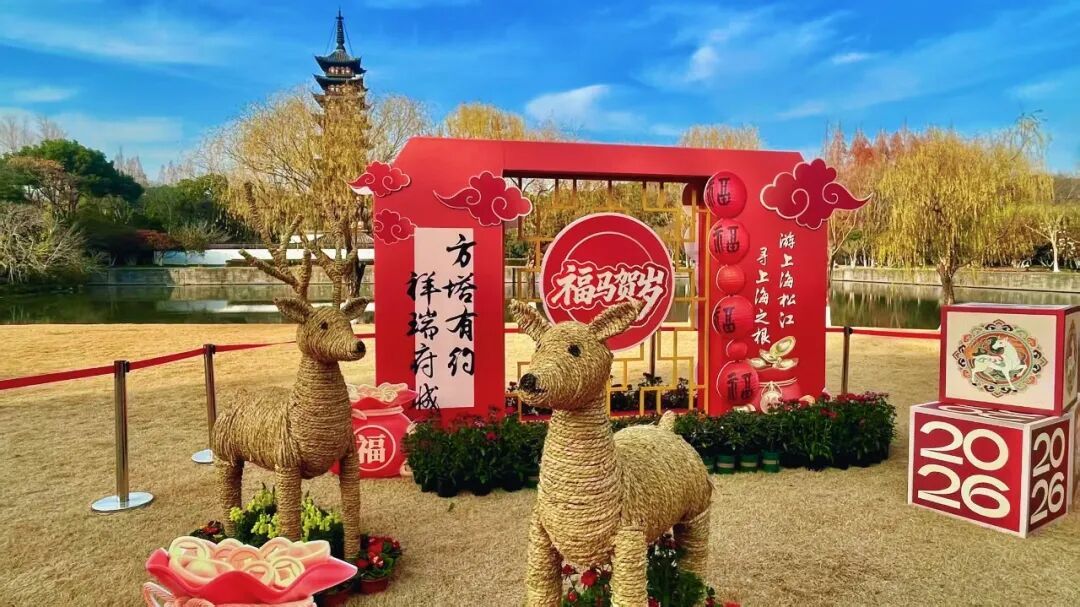 目前,方塔园内已张灯结彩。稻草编织的“2026”马头造型矗立在广场,造型昂首挺立、饰有红色福袋,寓意昂扬进取。大草坪、东大门等处布置了“福禄双全”“必定连升三级”等稻草艺术小品。园内道旗及读锦麟、竹亭等处的丝绸画印有“骐骥驰骋”“马上有福”等寄语,让游客在游园中解码吉祥寓意。“这里年味很浓,拍照打卡、散步都很不错。”一名游客称赞道。