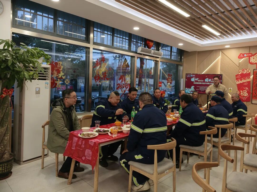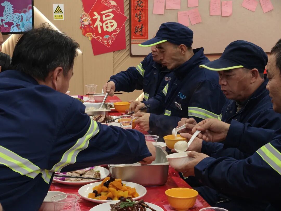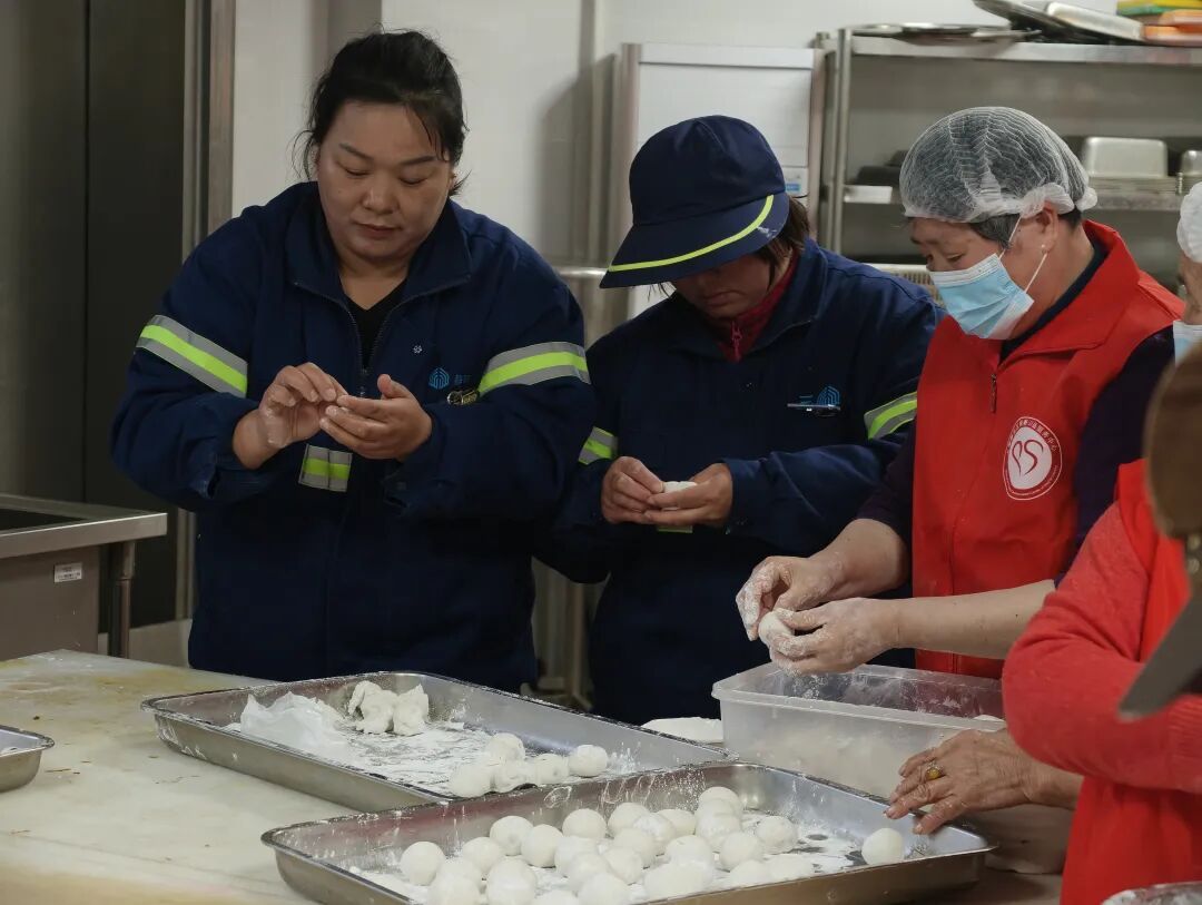 饺子出锅了。热气腾腾的盘子上桌,香气扑鼻的菜和饮料也摆了上来。彭浦镇和城发集团的相关负责人坐到职工中间,大家边吃边聊。有人说起老家,有人问起春节期间的排班安排。