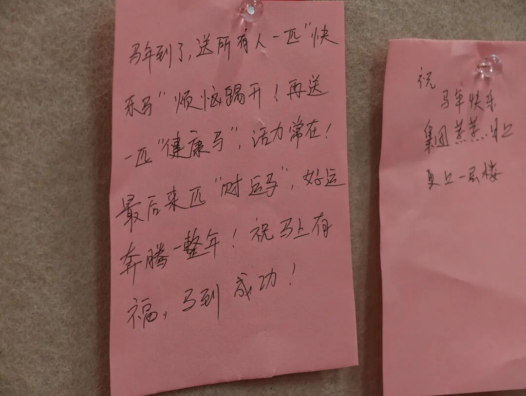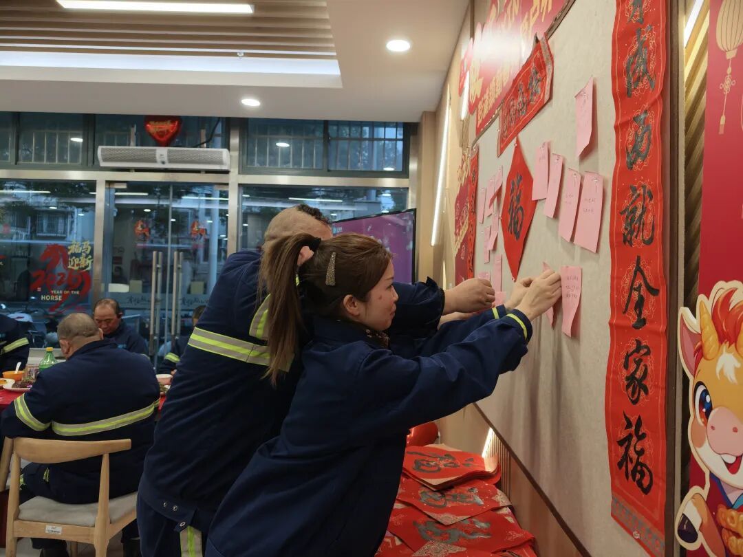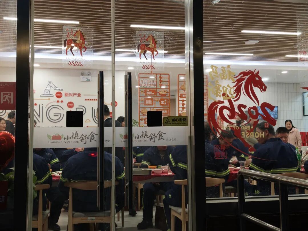 2月13日傍晚,彭浦镇永和路616号的小镇舒食社区食堂热气腾腾。近三十名环卫职工陆续走进来。有人在靠墙一块红色背景板前停了一会儿,写下自己的新年心愿。不一会儿,板子上已经贴了不少彩色便签,“身体健康”“工作顺利”“家人平安”——都是些朴素的愿望。