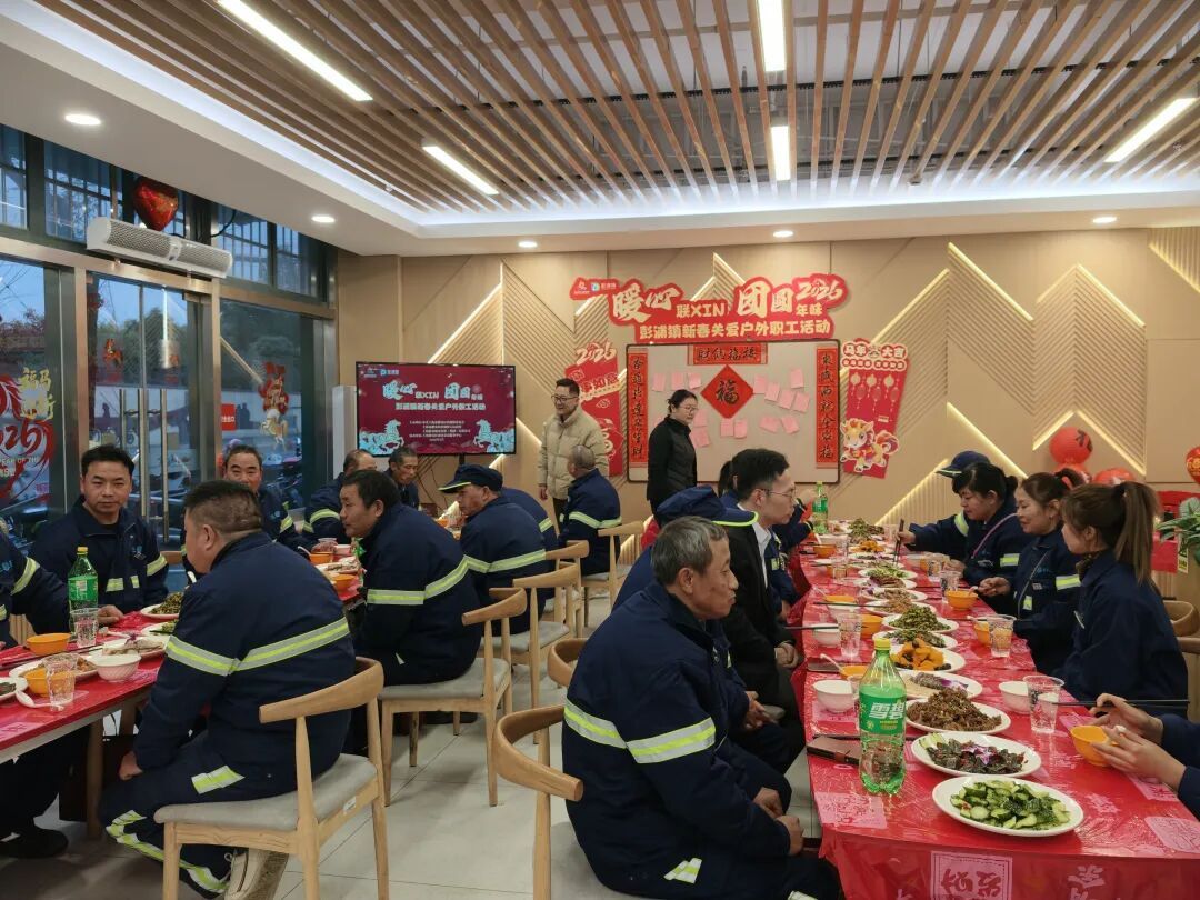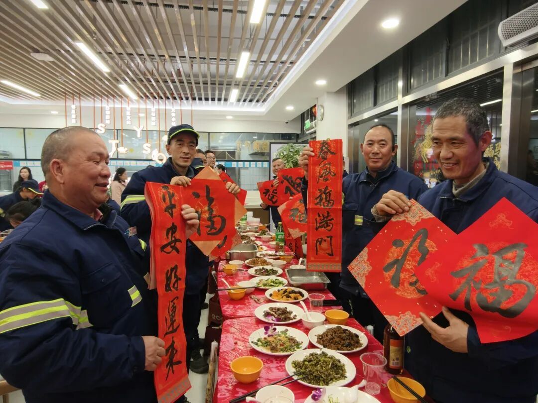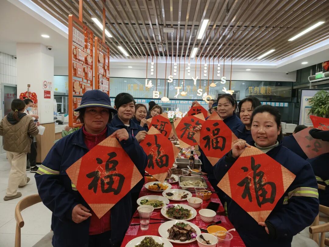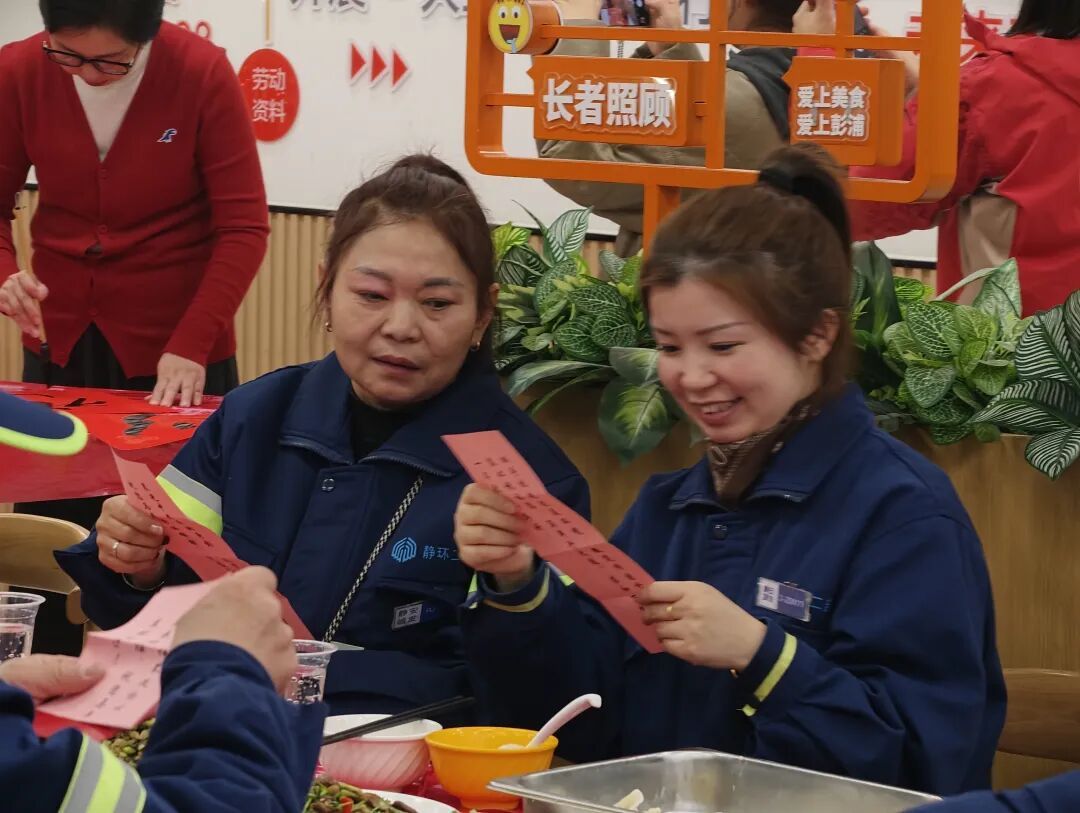 这是彭浦镇和静安城发集团联合举办的“暖心联XIN 团圆年味”新春关怀活动,邀请春节期间留守岗位的环卫工人,一起包饺子、吃汤圆、抽祝福,吃一顿热气腾腾的年夜饭。