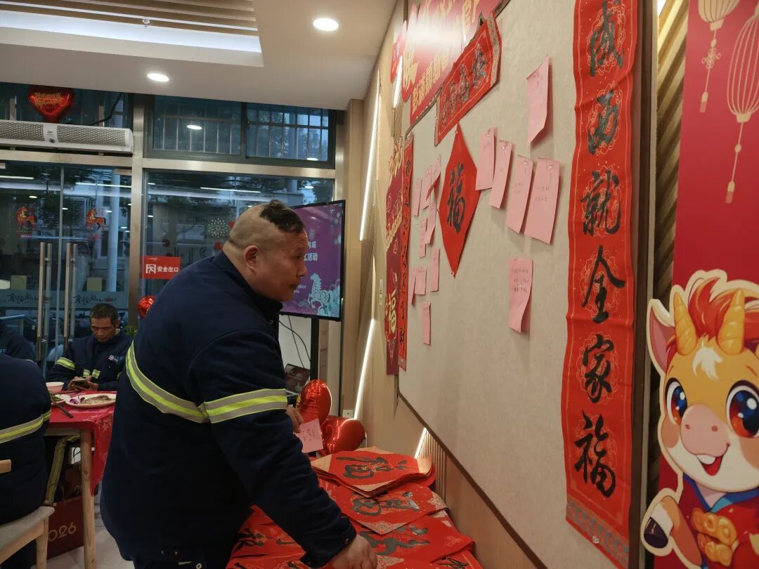 现场还请来了书法家,红纸铺开,墨汁倒上,一幅幅“福”字和对联刚写完就被围观的职工们接走,小心地放到一边晾着。人群中,也有几个职工跃跃欲试,接过毛笔在铺开的红纸上写下“福”字。笔画舒展,力道匀称。旁边的人凑过来看,发出惊叹,说平时拿扫帚的手,写得一手好字。
